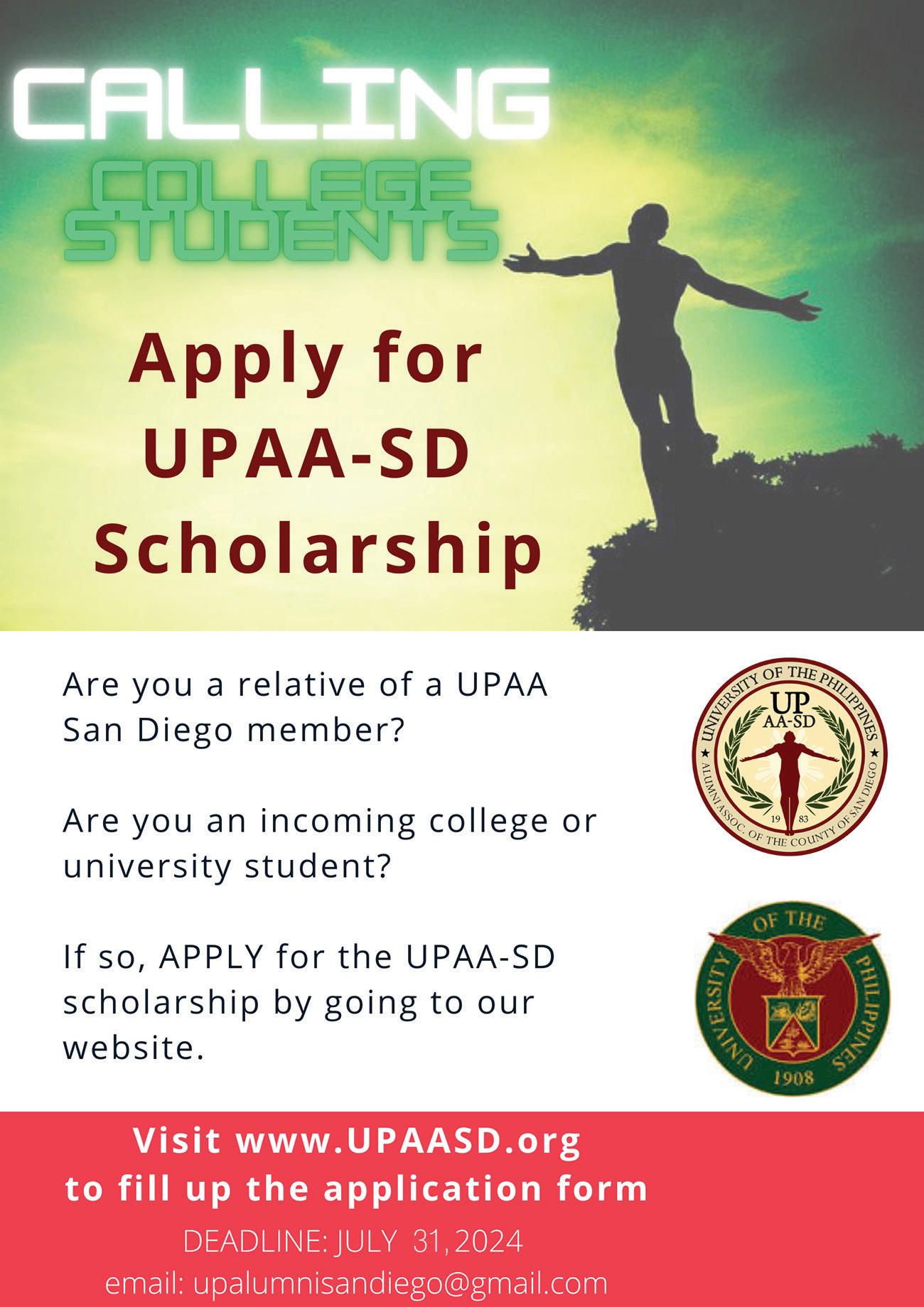 If you or someone you know is interested, please follow the below guidelines to apply online or contact our office at upalumnisandiego@ gmail.com or contact scholarship chair Kellie Sabas at kelliesabas@gmail. com if you have specific questions about this scholarship.