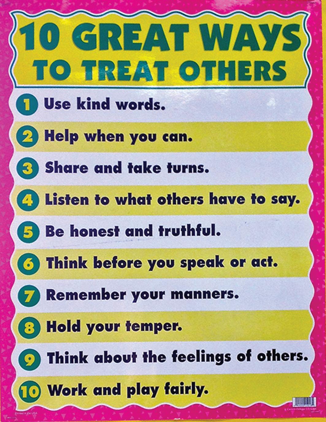 As I sat in a school auditorium to watch my nephew receive not one, but two awards for being both a positive role model of outstanding character for his peers and an outstanding citizen at his school’s assembly, a bulletin board caught my eye. The board was decorated in vibrant spring flowers and featured a poster with the title, “10 Great Ways to Treat Others.” As I read through the poster’s timeless lessons, I reflected on my busy week and the