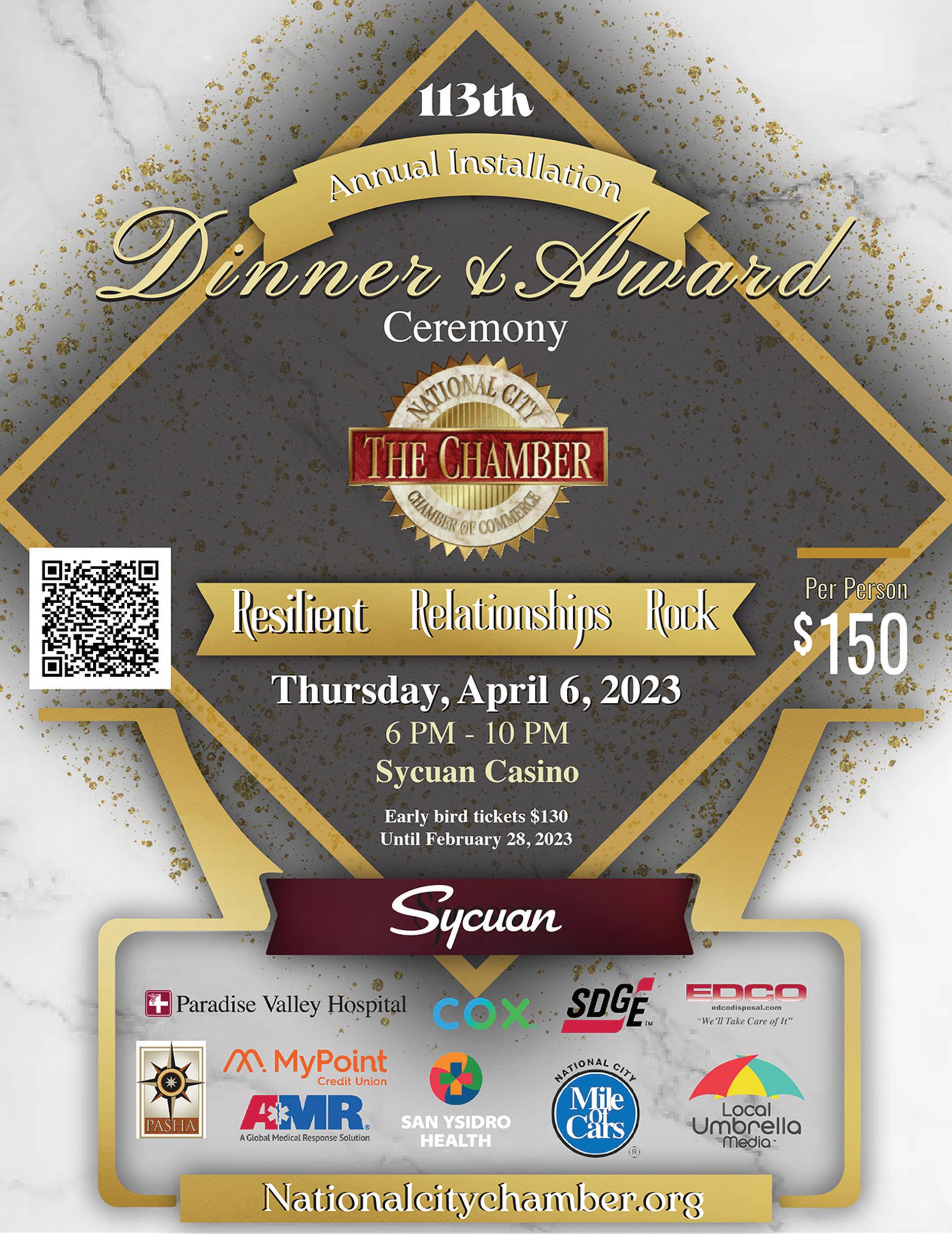 NATIONAL CITY, CA -- The National City Chamber of Commerce will hold its 113th Annual Installation Dinner and Award Ceremony on Thursday, April 6 from 6pm-10pm at Sycuan Casino and Resort. The theme for the event is Resilient, Relationships, Rock. Sponsors for the event are Sycuan Casino, Paradise Valley Hospital, Cox, SDGE, EDCO, PASHA, My Point Credit Union, AMR,San Ysidro Health, Mile of Cars and Local Umbrella Media.