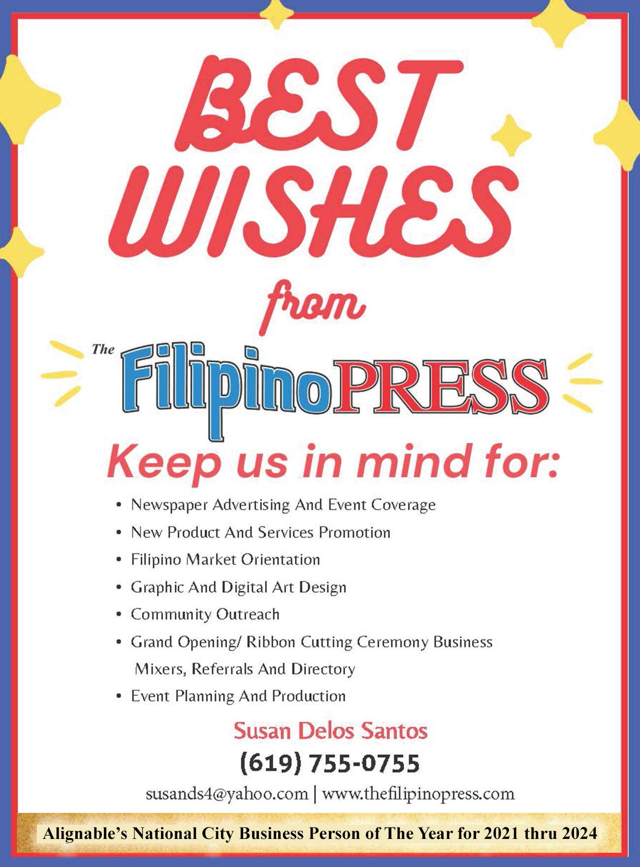 2 • May 10, 2024 - May 16, 2024 Filipino Press www.thefilipinopress.com Want to sell your products? PLACE YOUR AD TODAY! E-MAIL: filpressads@aol.com CALL: 619.434.1720
