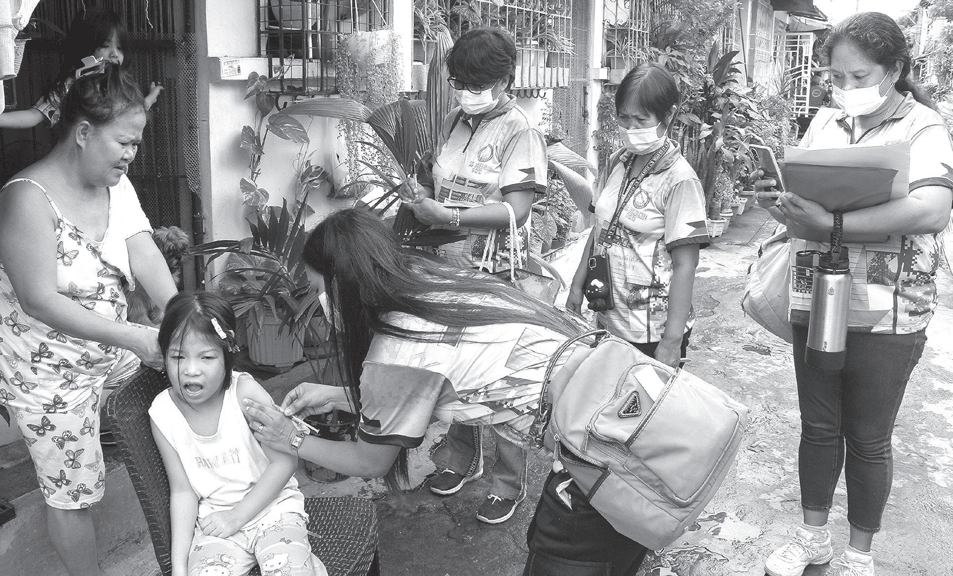MEASLES VACCINE. Kristine Joy Velando (3rd from left), a nurse from City Health Office I, administers free measles vaccine to Athena Ateya Ortiga, 7, during a door-to-door anti-measles campaign for children 7 years old and above at Molino Homes II Subdivision, Barangay Salitran 3, Dasmarinas City, Cavite, on Tuesday (Nov. 22, 2022). Measles cases in the country have continued to grow in 2022 based on the latest data from the Department of Health. (MNS photo)