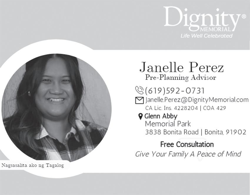 here. Attached is also a calendar and flyers of additional domestic violence awareness events that will take place throughout the month of October. See PBBM on 6 Since 1986 October 6, 2023 - October 12, 2023 www.thefilipinopress.com • (619) 434-1720 San Diego’s No. 1 Source of News & Information for the Filipino Community • An Award-Winning Newspaper ENROLLING NOW FREE CLASSES ONLINE AND IN PERSON EDUCATION | P10 INtERNAtIONAL CuISINES ADVENTURES IN TASTE SPECIAL OFFERS | P3 PAMPERED PINAY: FALL FAVES ChECk IT OUT! EMPOWERMENT | P2 Dr. Sahil Amin PBBM admin undertaking measures to ease inflation -- Palace DA Marks the Start of Domestic Violence Awareness Month with Special Event Candlelight Ceremony Honored Victims of Domestic Violence OpSam Health Ramps Up Dental Services Conveniently located in Mira Mesa and National City RICE PRICES. A retailer displays varieties of rice and their prices at the Trabajo Market in Sampaloc, Manila on Tuesday (Oct. 3, 2023). The Department of Agriculture said President Ferdinand R. Marcos Jr. may soon lift the implementation of the mandatory price caps on rice due to the decreasing rice prices in local markets and increased supply of local harvest in the last quarter of 2023. (MNS photo) See O P sa M on 6