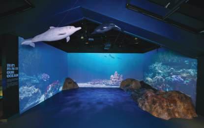設於海洋科學展廳,沉浸式空間讓參觀者置 身於水底世界,在模擬海床上一邊漫步、一