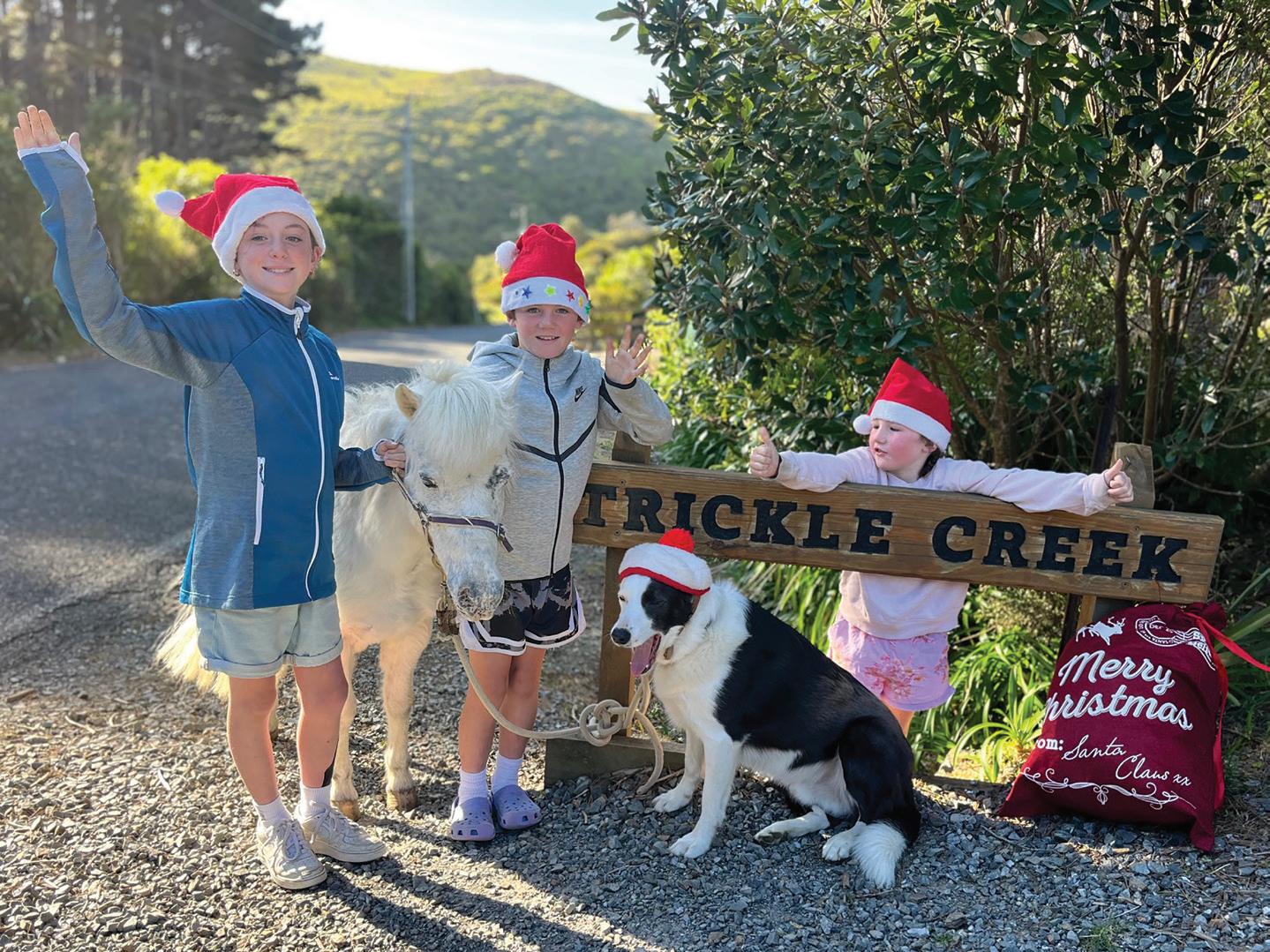 Getting into the spirit for Christmas Live are sheepdog Shadow and pony Scoobie with Molly Innes, her brother Teddy and sister Hazel from Muritai School.
