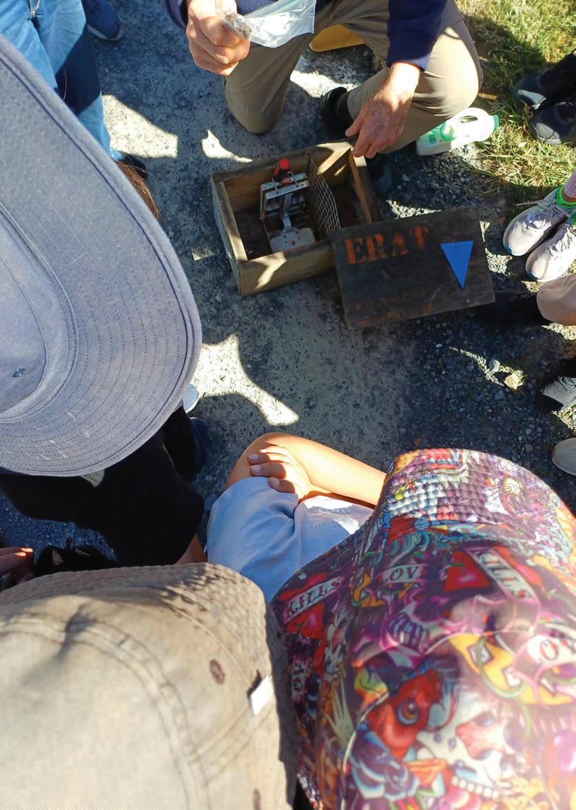Next stop Parker Jones from MIRO told the kids about the predators that threaten native species, from stoats and rats and cats, to the surprising culprit—hedgehogs. Parker showed the variety of gear MIRO uses to control these predators: traps, baits, poisons, wildlife cameras and tracking tunnels.