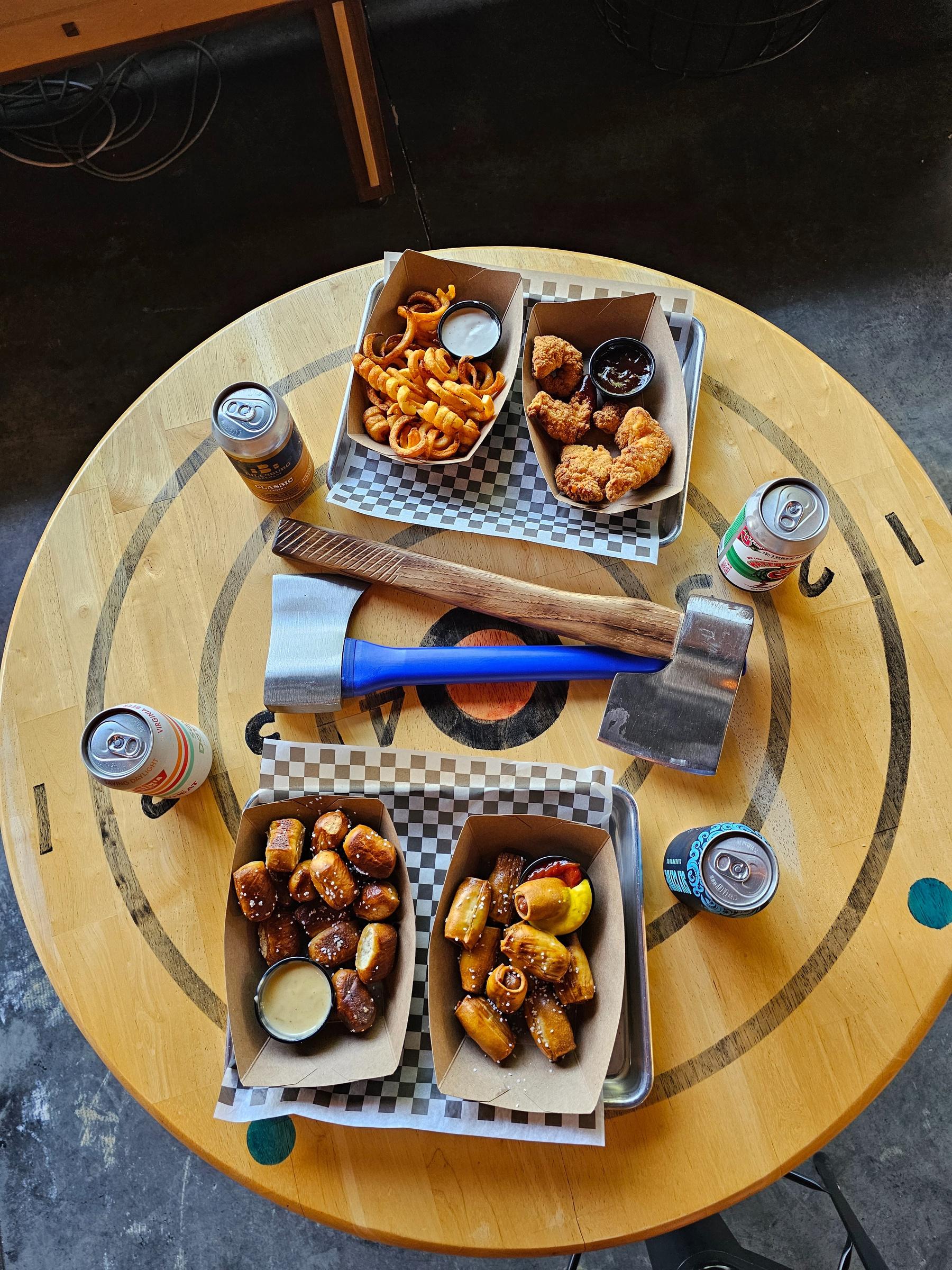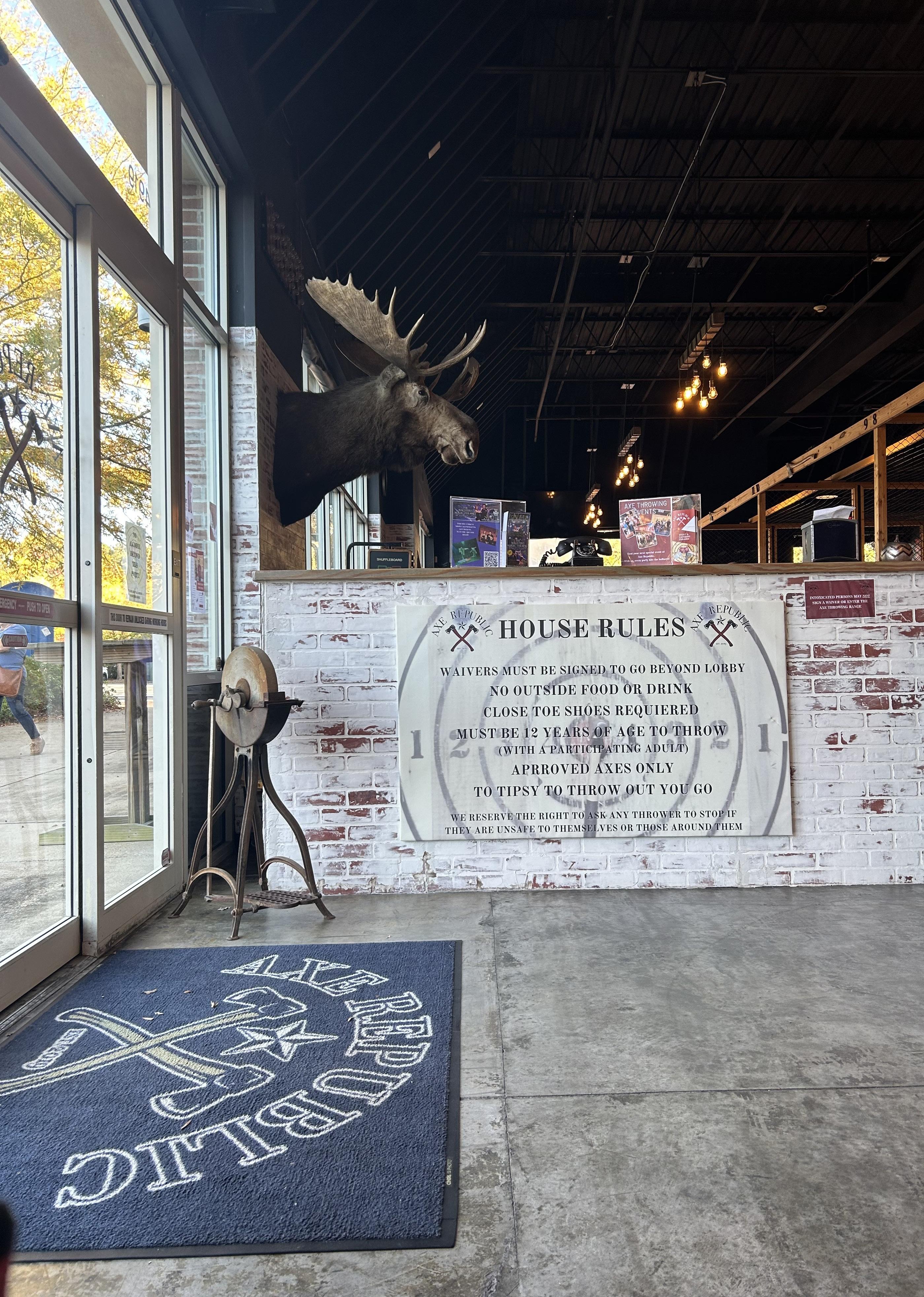 I sampled the food, their pretzel bites exceeded my expectations. I originally imagined the standard baseball game pretzels and nacho cheese, but the food was very well-made, hot, and the cheese sauce was top-tier quality. With an enjoyable atmosphere and great food, I highly recommend others to check it out, especially on Thursday nights when college students get a 15% discount and a free appetizer! Overall, it is, without a doubt, one of the hit spots for students at the College of William and Mary, a spot where you can take a breather from endless amounts of schoolwork by taking a break and throwing axes with friends. When you go, tell Axe Republic’s Marty the Moose that Flat Hat Magazine sent ya!