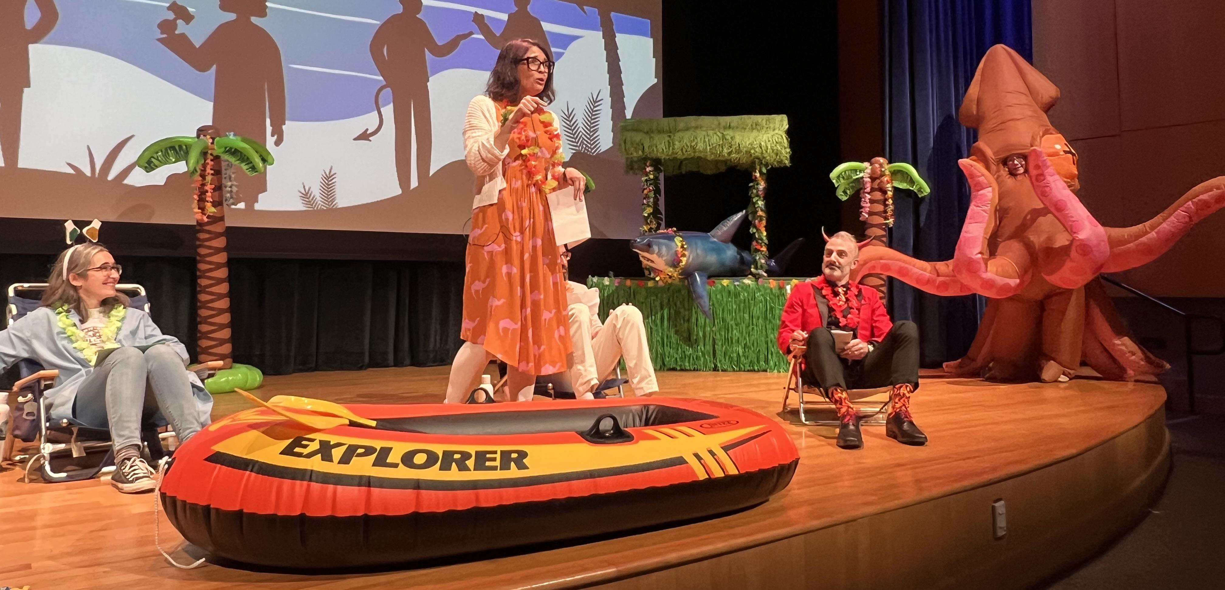 upon her arrival. Flower wreaths were available at a table outside the auditorium, and the stage was decorated to resemble an island, including inflatable palm trees, beach chairs and more.