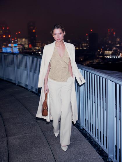 OPPOSITE: Livri Top, Ivory sculpt stretch knit. Alzira Trousers, Stone Japanese doppio crepe. ABOVE: Mendoza Top, Ivory sculpt stretch knit. Solaro Jacket , Ivory sculpt stretch knit. Tresana Shirt Ivory and blue stripe cotton shirting. Alzira Trousers , as above. San Pietro 45 Heel, Ivory leather. Also available in silver and chartreuse.