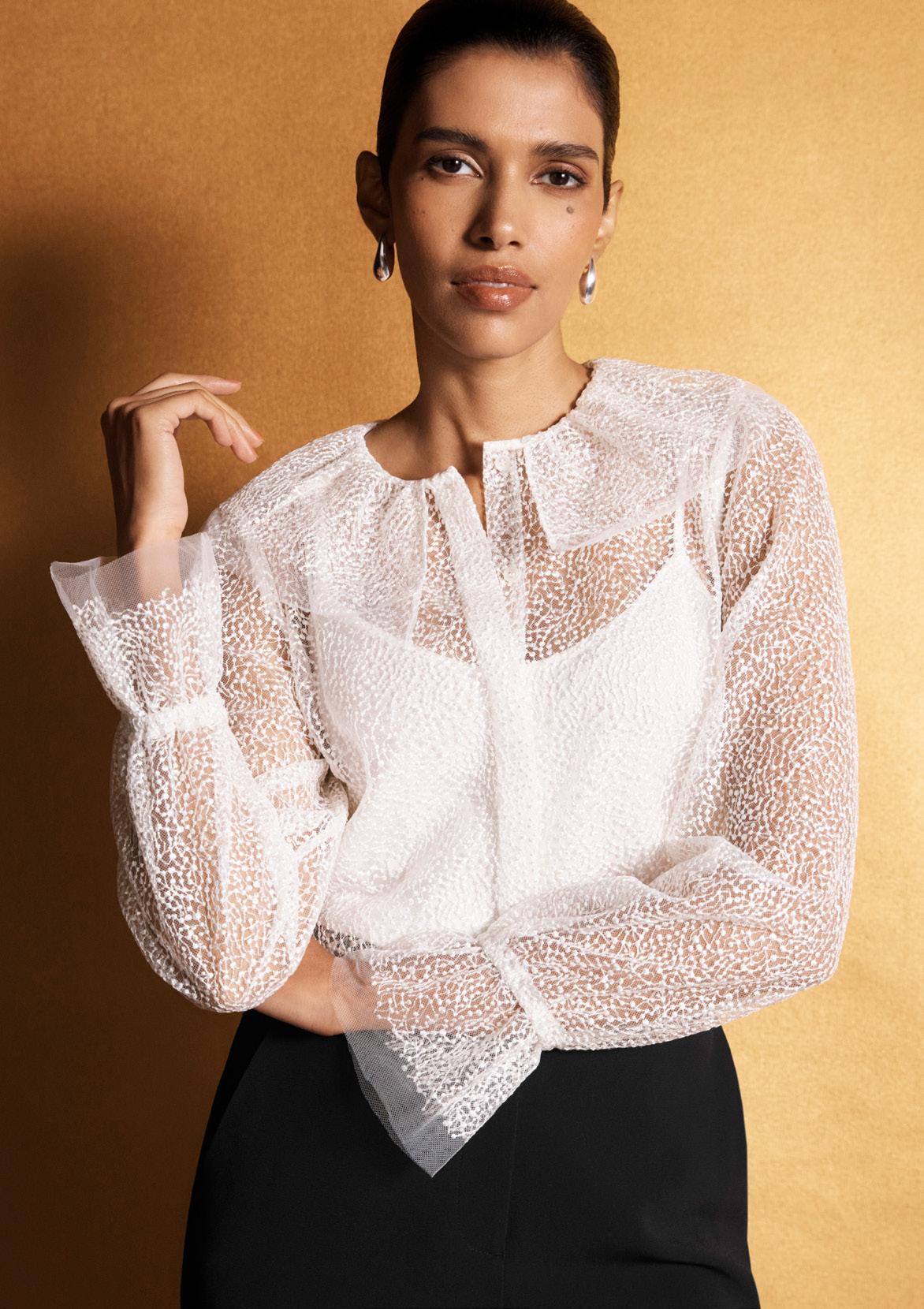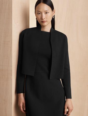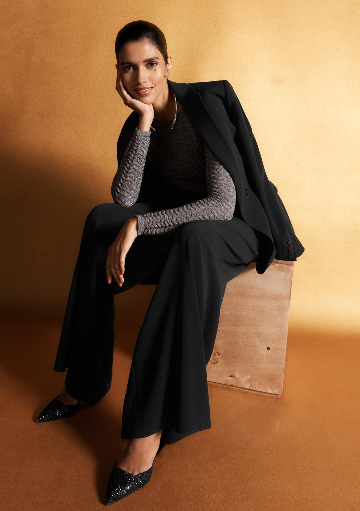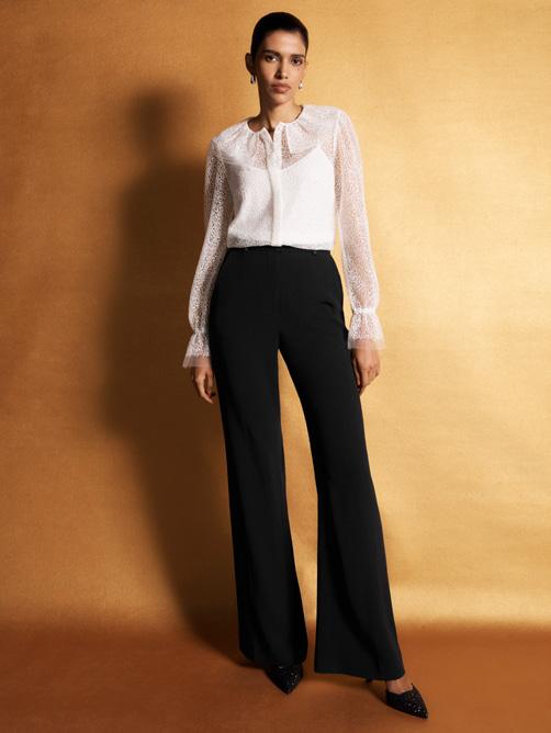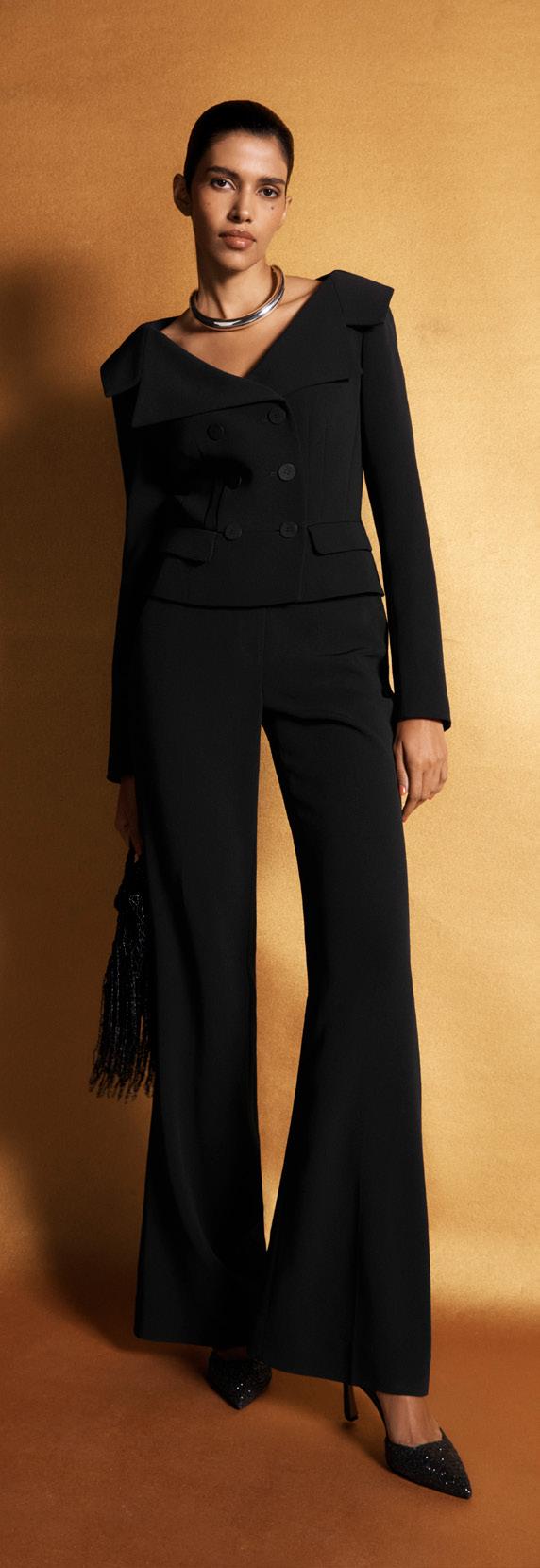 Keighley Top, Black sculpt stretch knit. Also available in ivory. Capella Skirt, Black dot fil coupe. Clever Crepe Hamilton Jacket, Black Japanese satin back crepe. Soleto Blouse, Ivory sequin lace. Clever Crepe Lexington Trousers, Black Japanese satin back crepe. Also available in navy. Treviso 80 Heels, Black metallic fabric. Also available in gold.