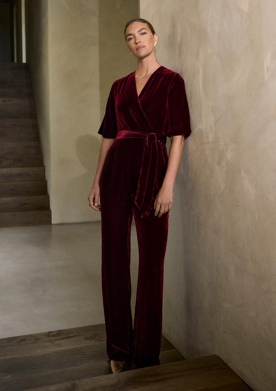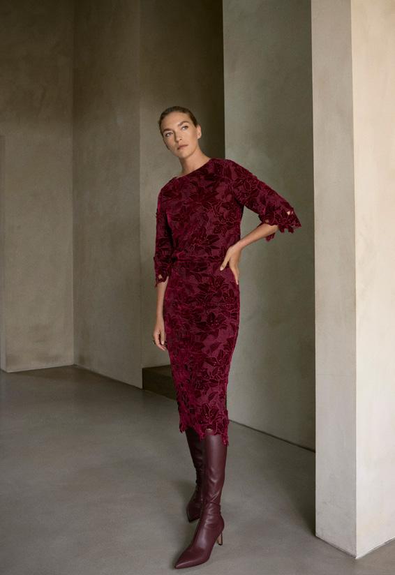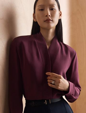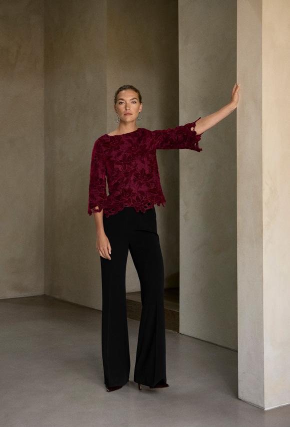This page: Langford Jumpsuit , Dark crimson velvet. Treviso 80 Heels , Gold metallic fabric. Opposite: Como Shirt , White Italian stretch cotton. Ameria Top , Kerrison Skirt , Dark crimson velvet lace. Laurito 65 Boots , Burgundy stretch fabric. Also available in black. Ocana Blouse, Kelmore Skirt , Deep plum satin. Clever Crepe Lexington Trousers , Black Japanese satin back crepe. Also available in navy. Savona 80 Heels , Dark wine patent leather.