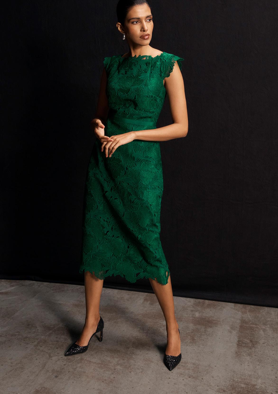 Ventura Dress, Dark emerald floral lace. Treviso 80 Heels, Black metallic fabric. Also available in gold.