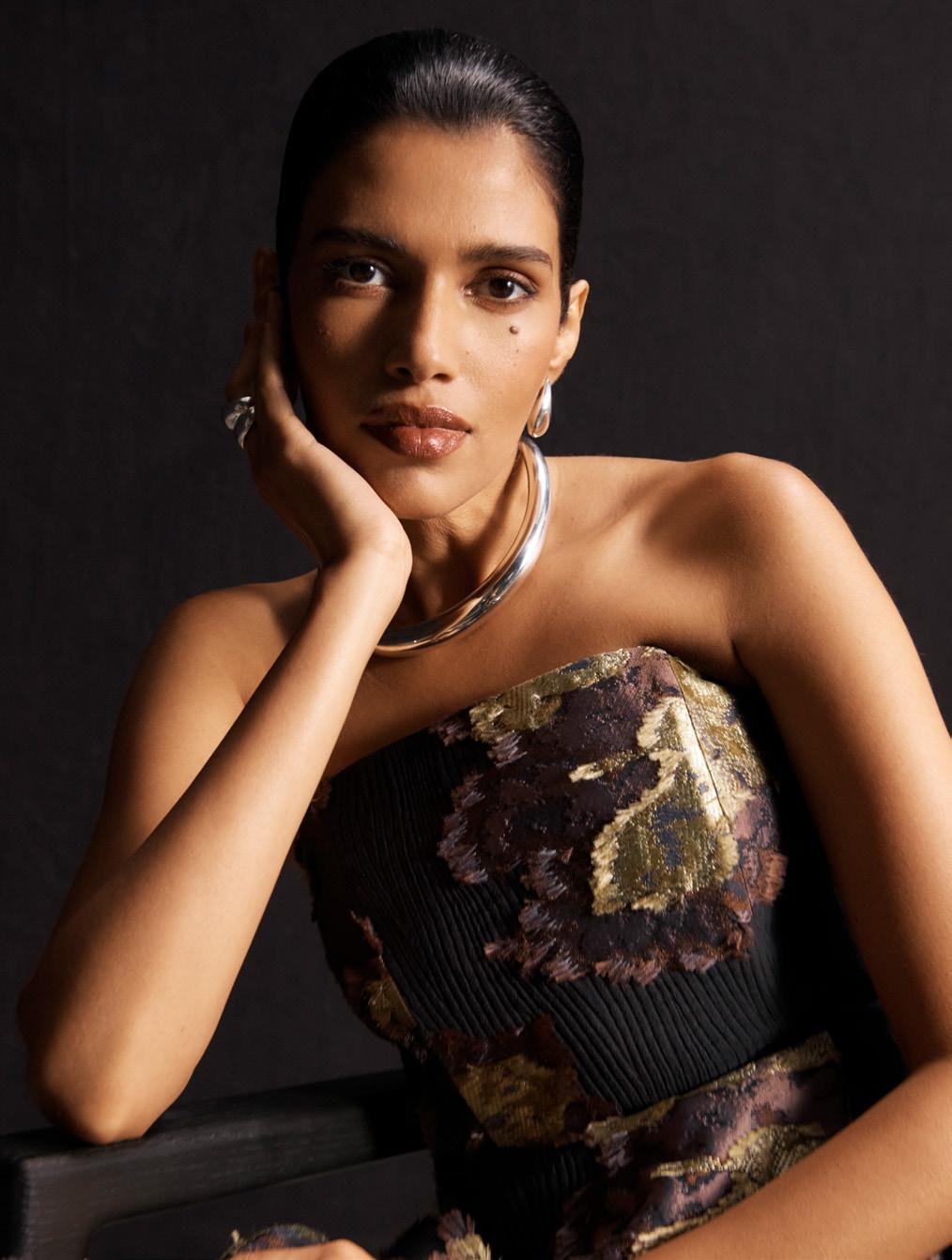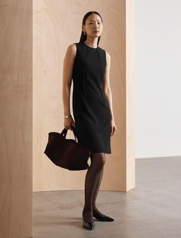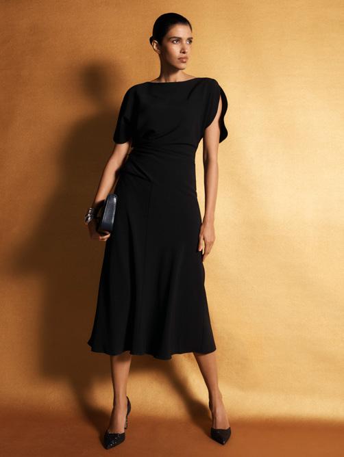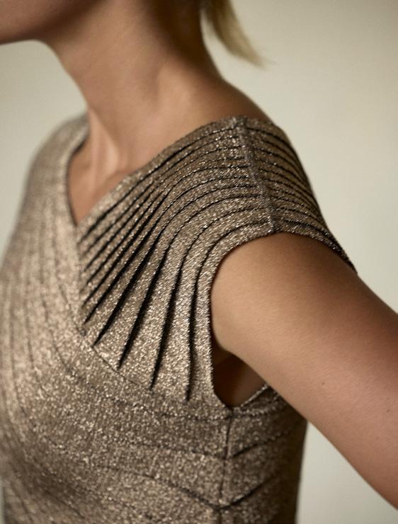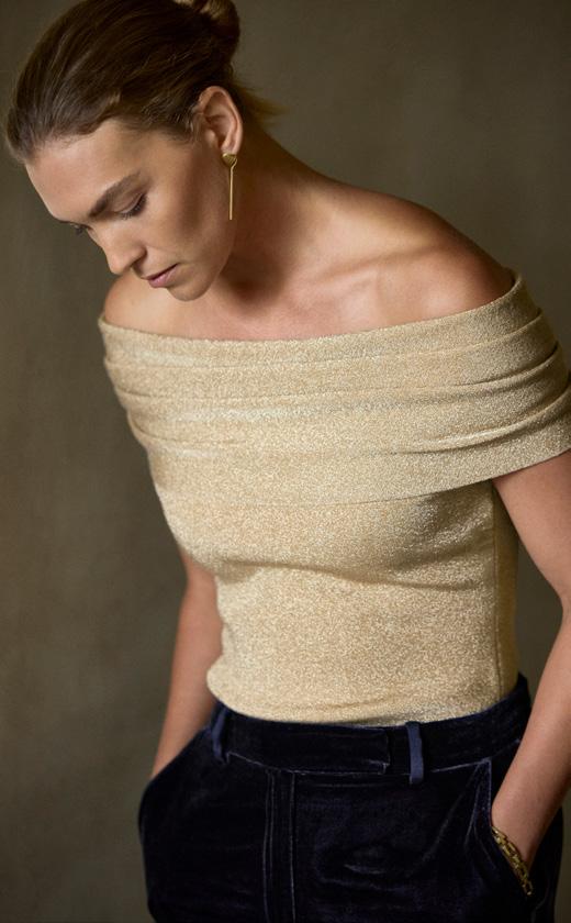 Aspen Top, Bronze metallic knit. Clever Crepe Adelaide Trousers, Black Japanese satin back crepe. Also available navy, ivory and plum. Treviso 80 Heels, Gold metallic fabric. Sculpt Knit Gradara Dress, Black sculpt stretch knit. Also available in deep plum. Jura Dress, Black metallic knit.