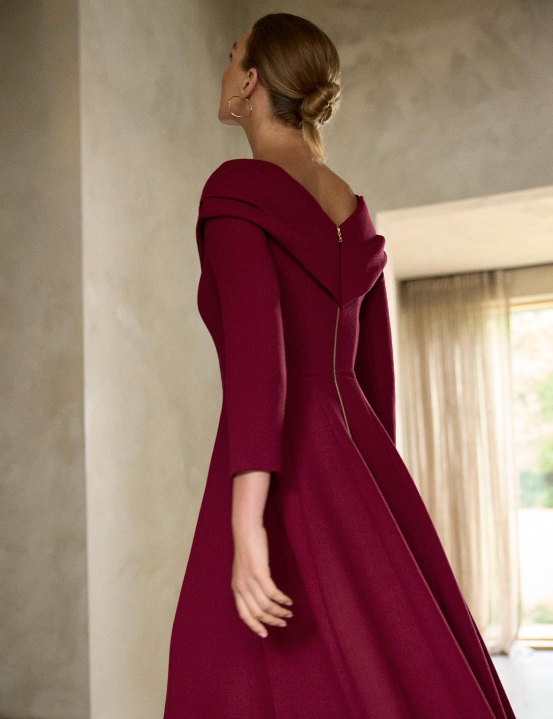 Palermo Dress , Crimson Italian pure wool double crepe. Treviso 80 Heels , Gold metallic fabric. Also available in black.