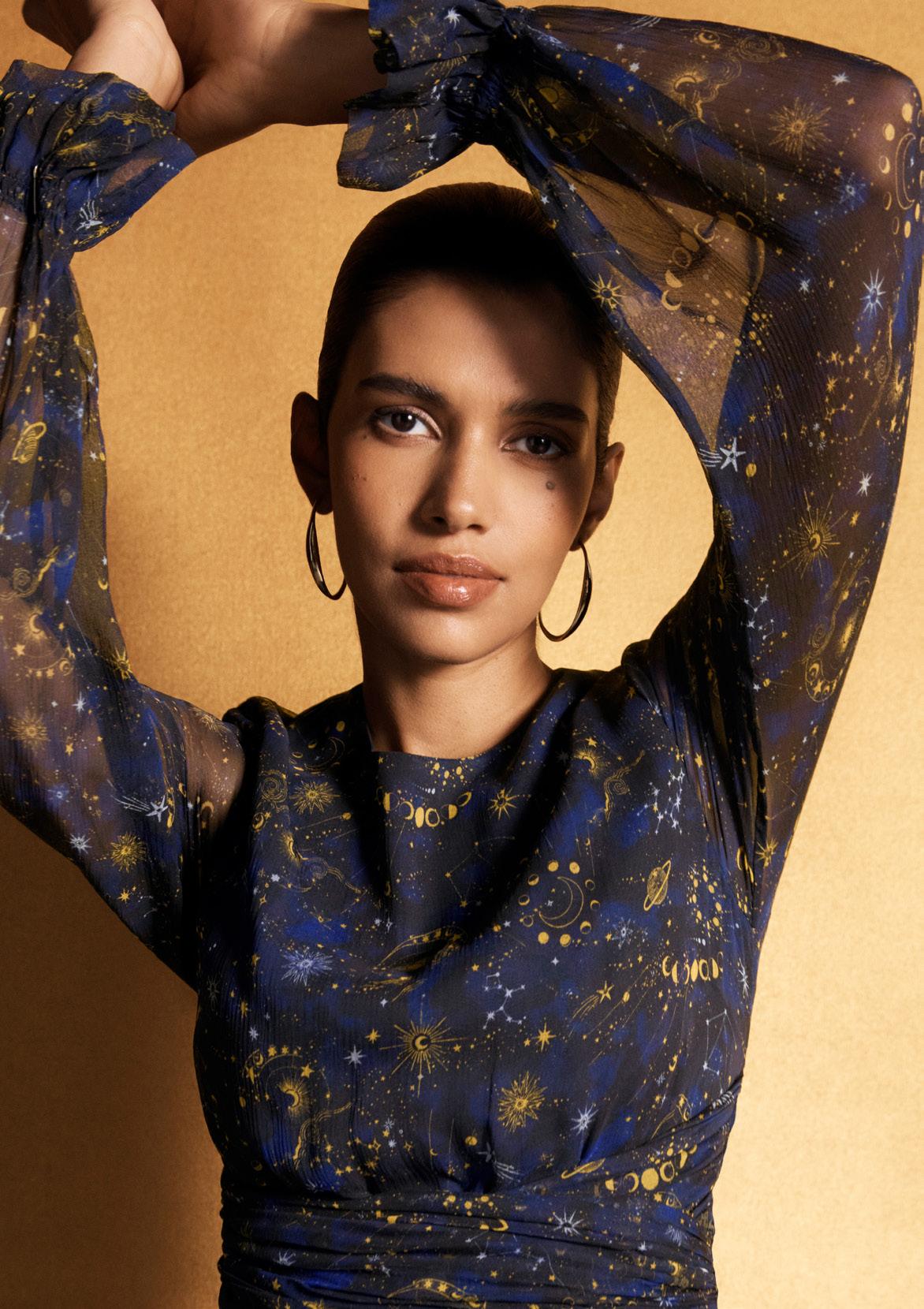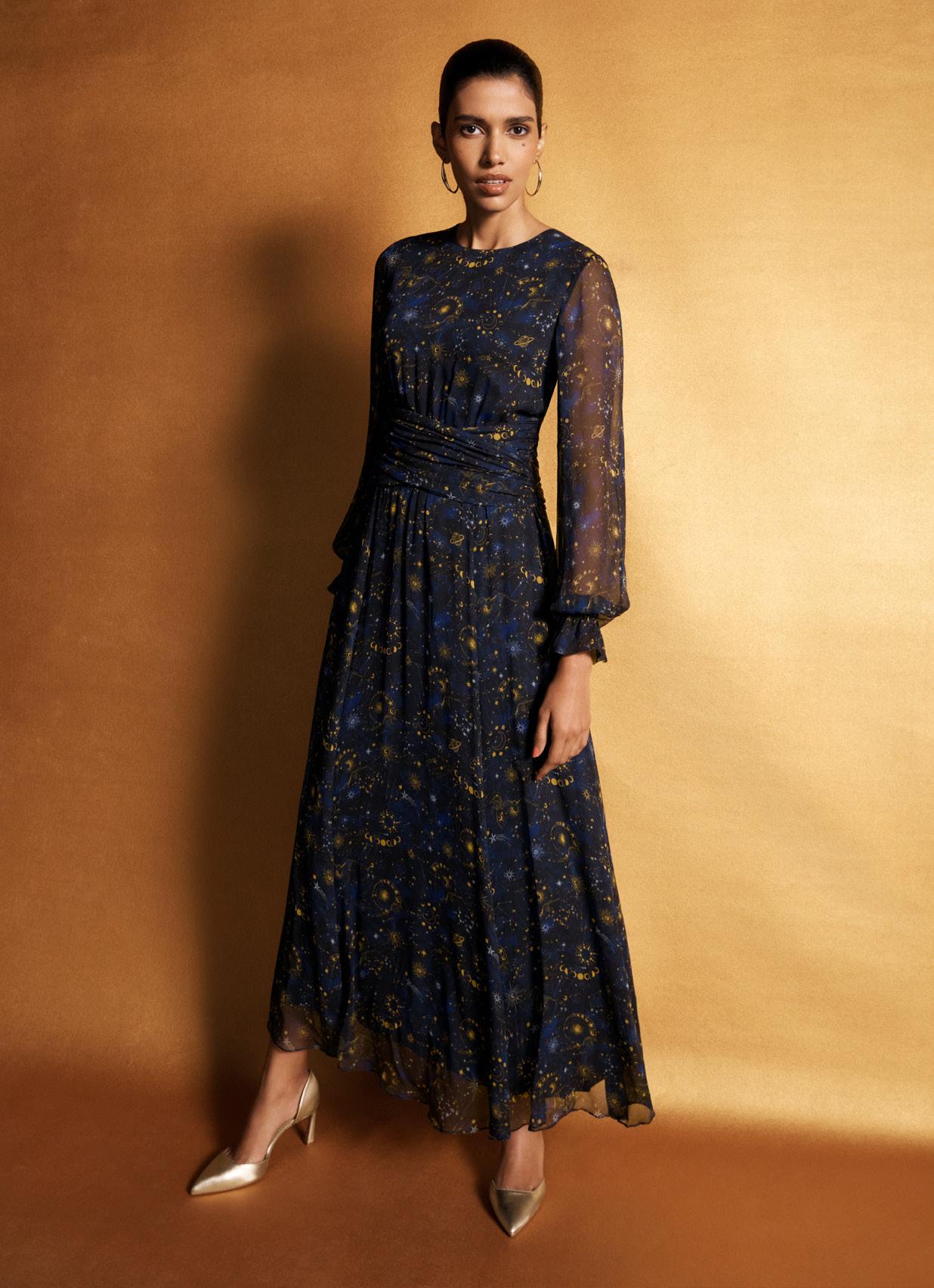 Portofino Dress, Navy celestial print crinkled silk georgette. Treviso 80 Heels, Gold metallic fabric. Also available in black.
