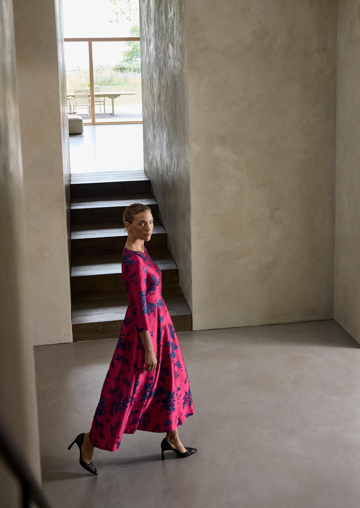 Transforming our bestselling Knighton style, Arrowsmith painted directly onto the jacket, which was then turned into an exquisite jacquard in Italy. The same work of art –the London Plane – also features on our stunning Ameno dress.