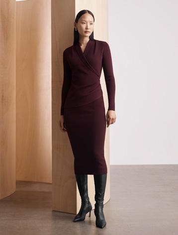 First row: Sculpt Knit Gradara Dress, Deep plum knit. Bowery Blouse, Plum silk stretch. Harley Belt, Black leather. Clever Crepe Palmerston Top, Deep plum Japanese satin back crepe. Clever Crepe Adelaide Trousers, Black Japanese satin back crepe. Second row: Clever Crepe Knighton Jacket, Clever Crepe Adelaide Trousers, Deep plum Japanese satin back crepe. Savona 80 Heels, Dark wine patent leather. Clever Crepe Sanmero Dress, Black Japanese satin back crepe. Piedmont 35 Heels, Black croc-embossed leather. Third row: Clever Crepe Belleville Top, Ivory Japanese satin back crepe. Clever Crepe Knighton Jacket, Clever Crepe Adelaide Trousers, Black Japanese satin back crepe. Rhodes T-Shirt, Ivory cotton jersey. Elba 80 Heels, Black patent leather. Sculpt Knit Miri Jacket, Sculpt Knit Parella Dress, Black knit.