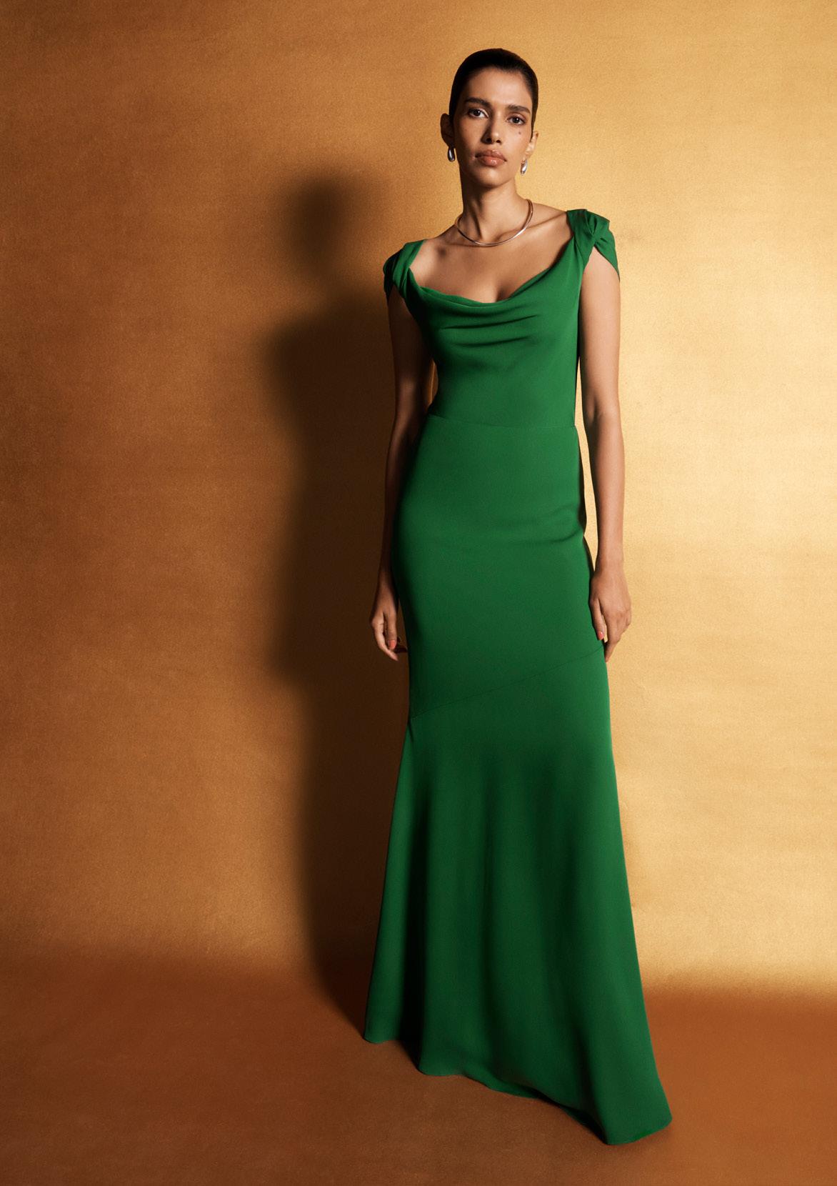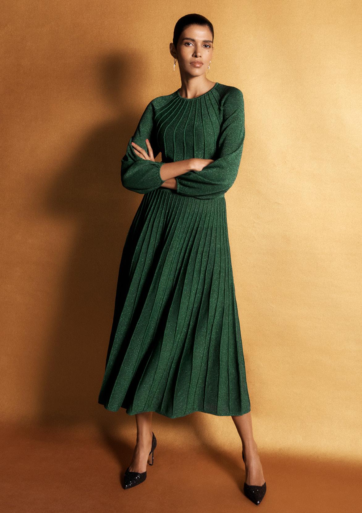 Lumia Dress, Dark emerald metallic knit. Treviso 80 Heels, Black metallic fabric. Also available in gold.