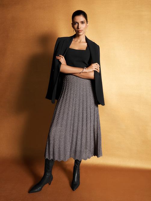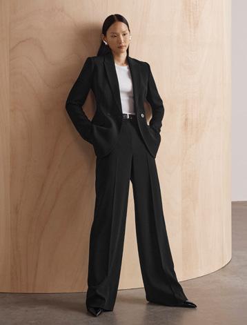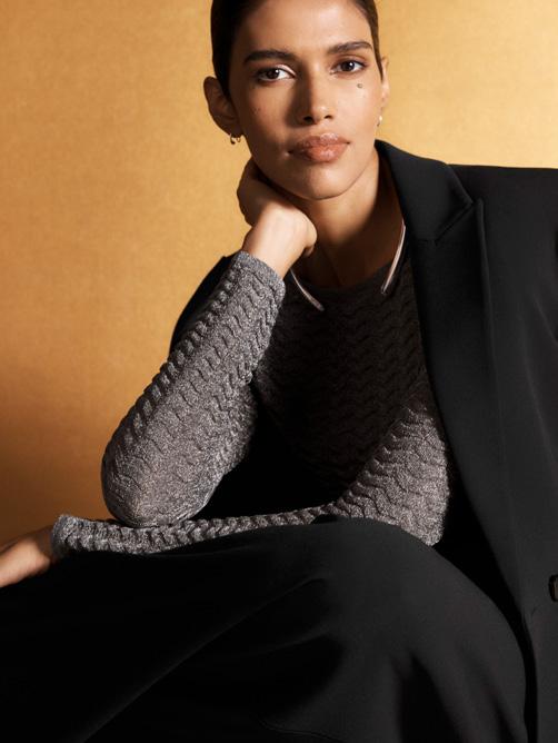 Ashford Top, Dark Silver metallic knit. Clever Crepe Knighton Jacket, Black Japanese satin back crepe. Also available in navy, ivory and plum. Clever Crepe Lyon Trousers, Black Japanese satin back crepe. Treviso 80 Heels, Black metallic fabric. Also available in gold. Keighley Top, Black sculpt stretch knit. Also available in ivory. Irvine Skirt, Dark Silver metallic knit. Laurito 65 Boots, Black stretch fabric. Also available in burgundy.