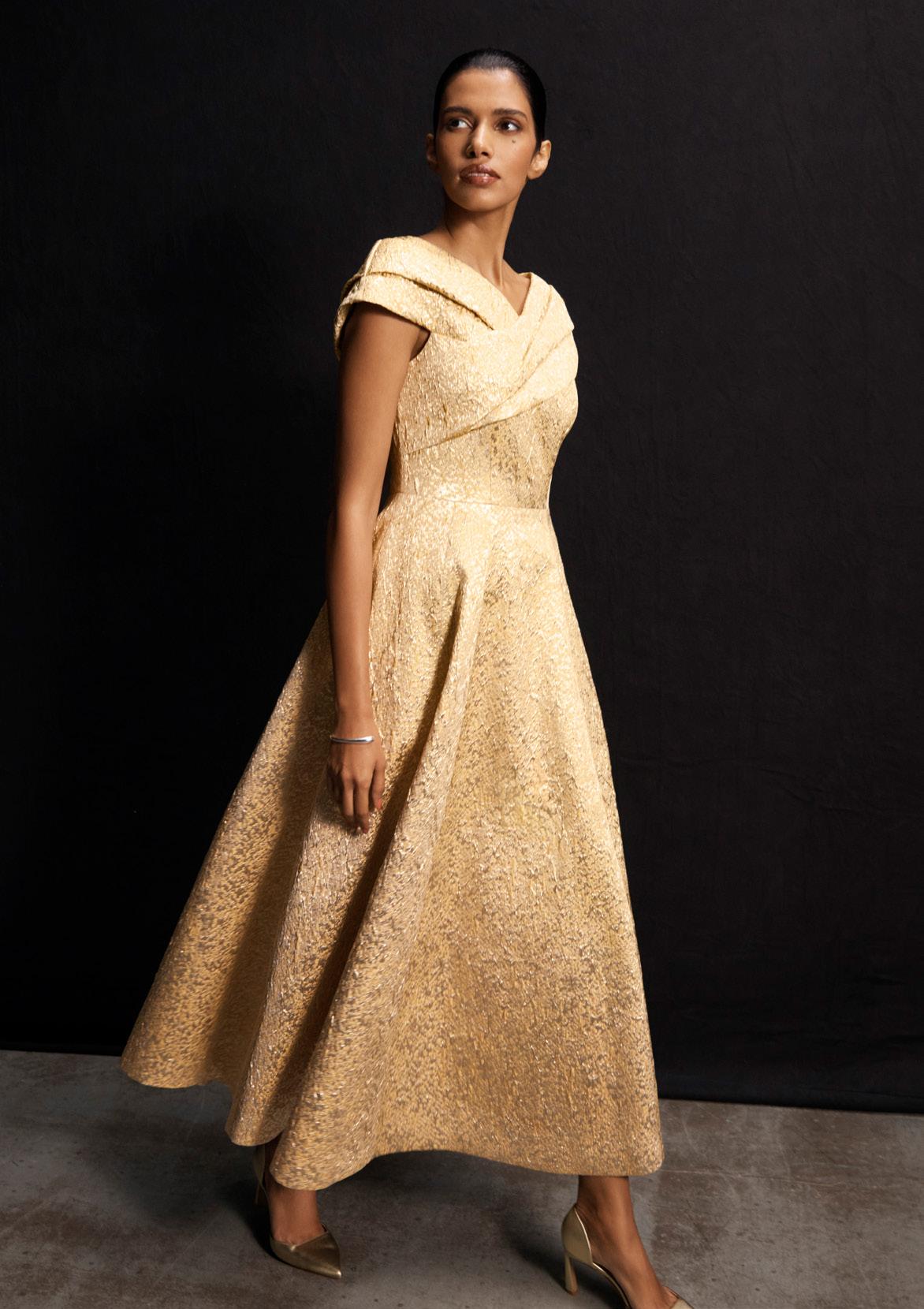 This page: Ameno Dress , Navy and gold Italian leaf jacquard. Treviso 80 Heels , Gold metallic fabric. Also available in black. Opposite: Knighton Jacket , Esme Trousers , Black and gold Italian leaf jacquard.