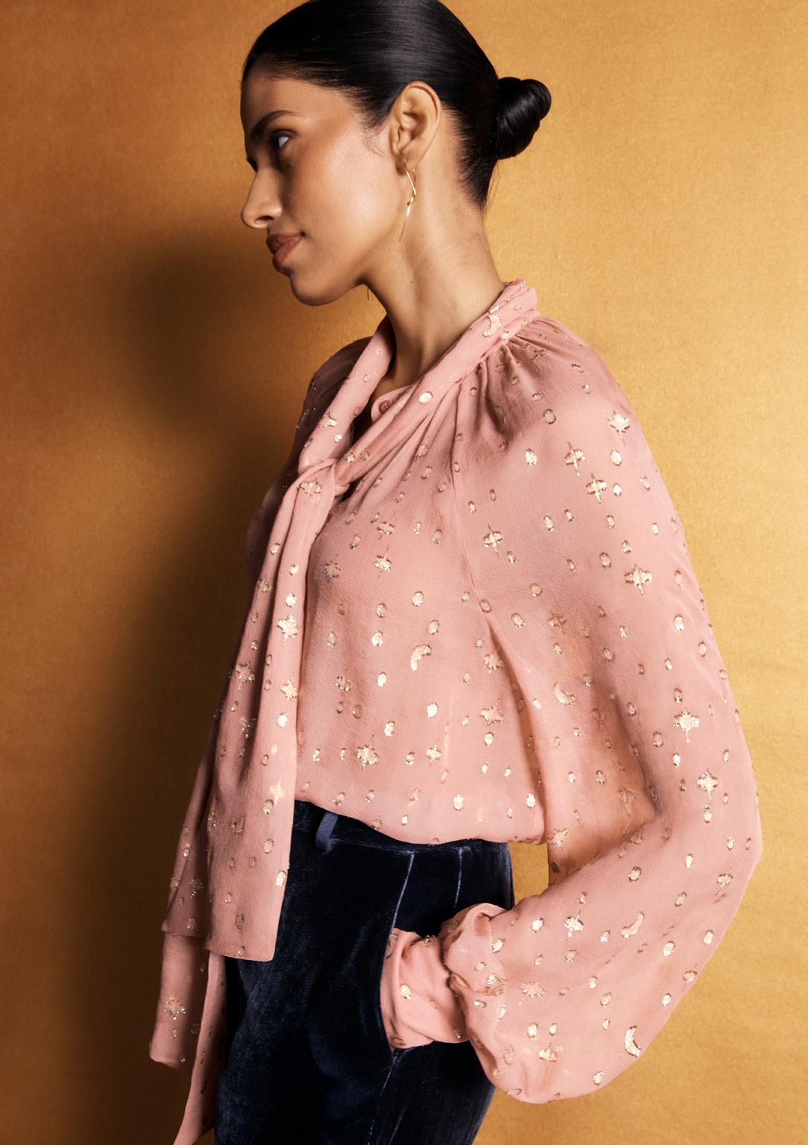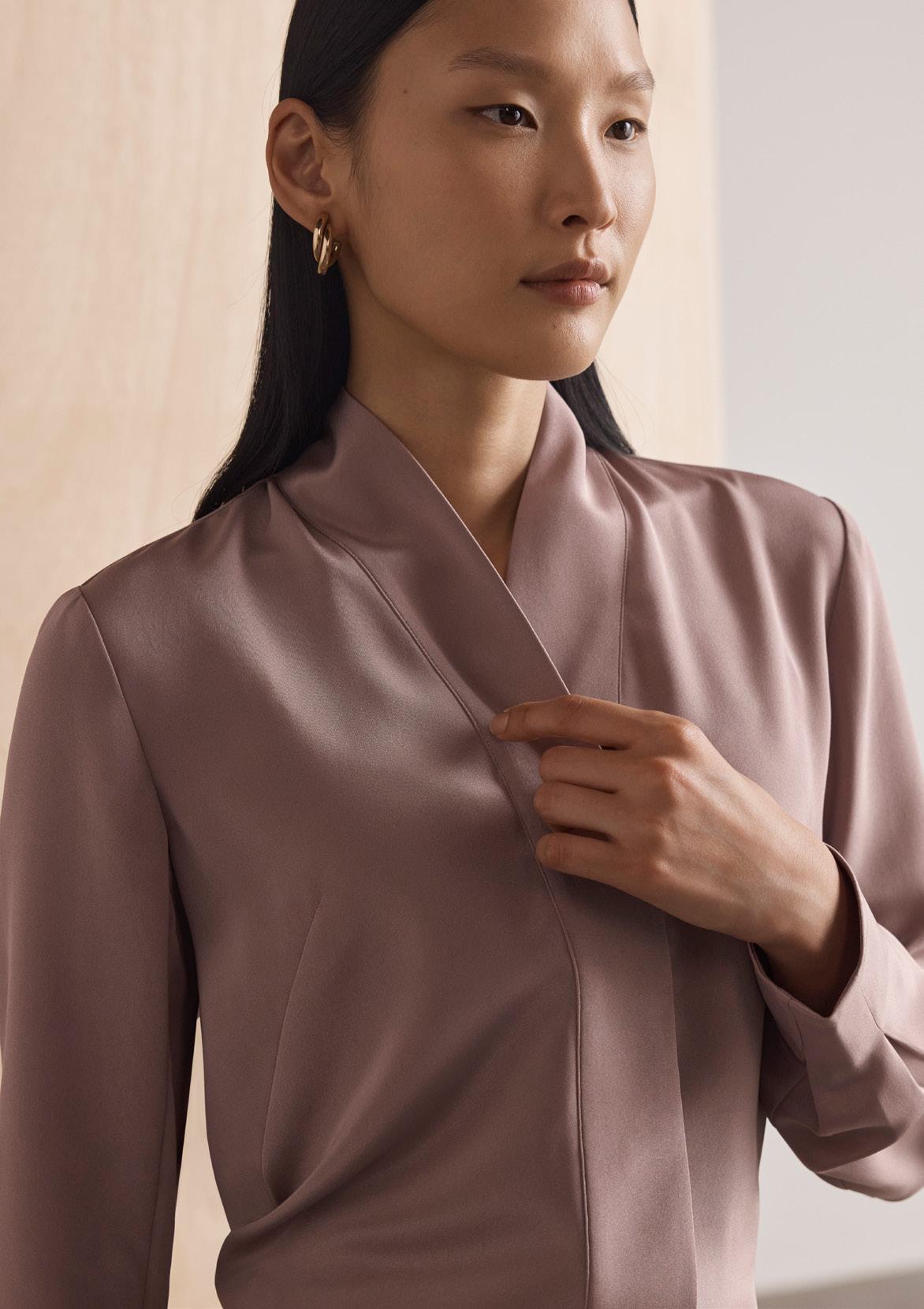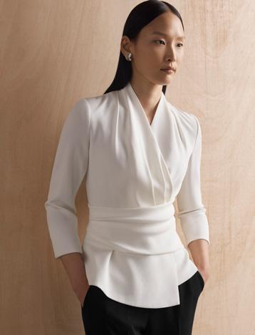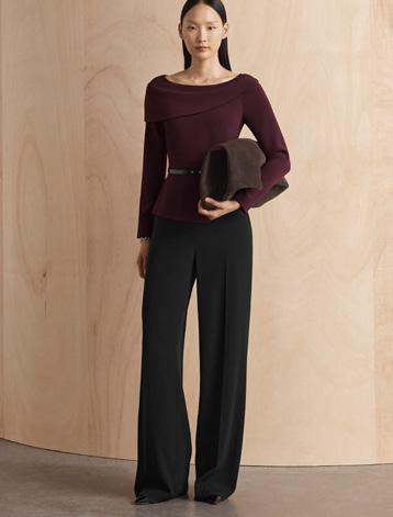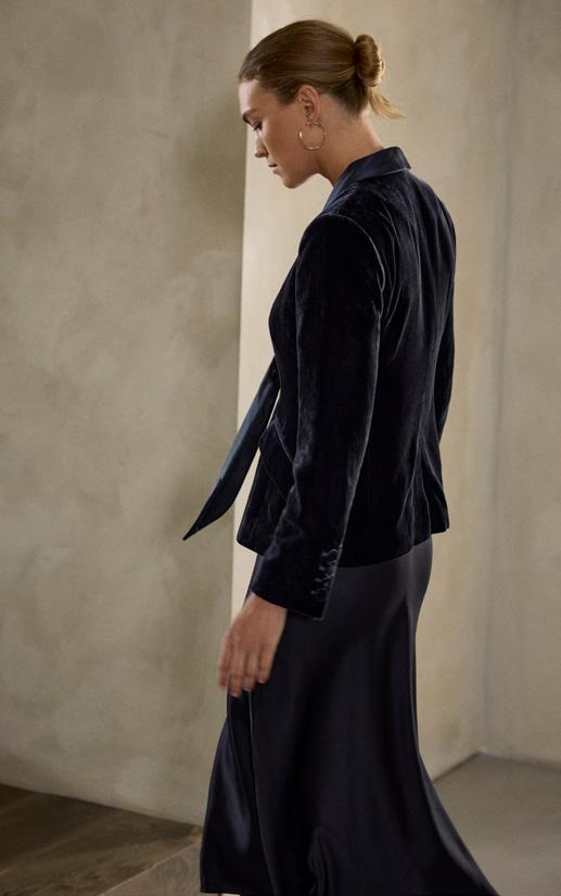 Clever Crepe Palmerston Top, Ivory Japanese satin back crepe. Also available in deep plum. Clever Crepe Lexington Trousers, Navy Japanese satin back crepe. Also available in black. Selis Belt, Black croc-embossed leather. Treviso 80 Heels, Black metallic fabric. Also available in gold. Clever Crepe Salerno Dress, Black Japanese satin back crepe. Also available in vibrant blue. Lusia Blouse, Soft pink celestial fil coupe. Lexington Trousers, Navy velvet. Treviso 80 Heels, Gold metallic fabric.