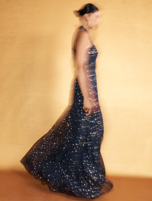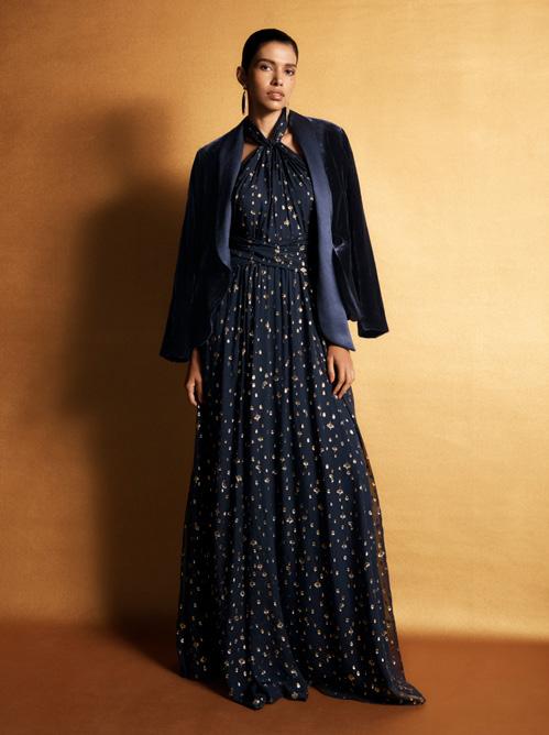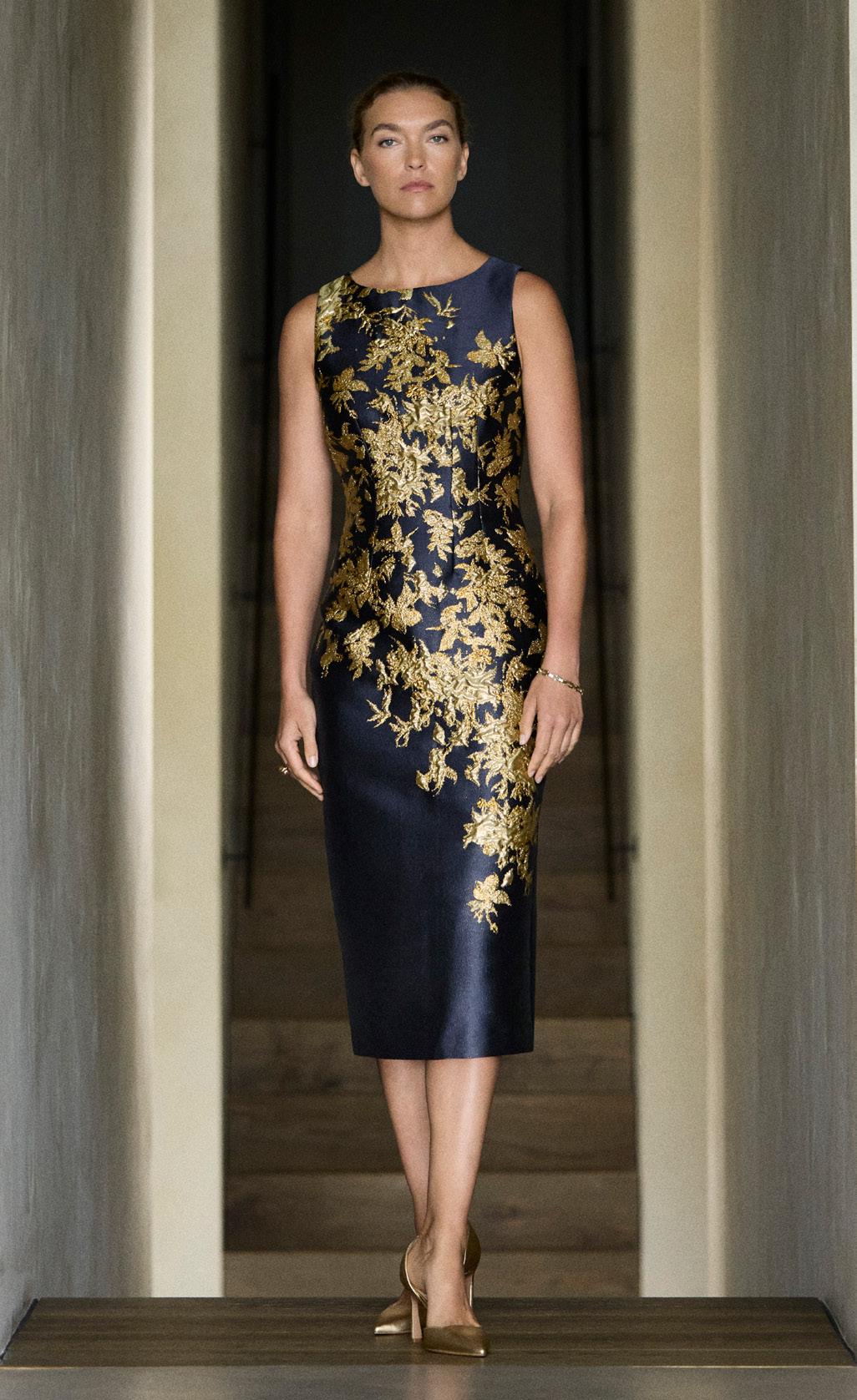 Rivara Dress, Navy celestial fil coupe. Lennox Jacket, Navy velvet. Treviso 80 Heels, Gold metallic fabric. Also available in black.