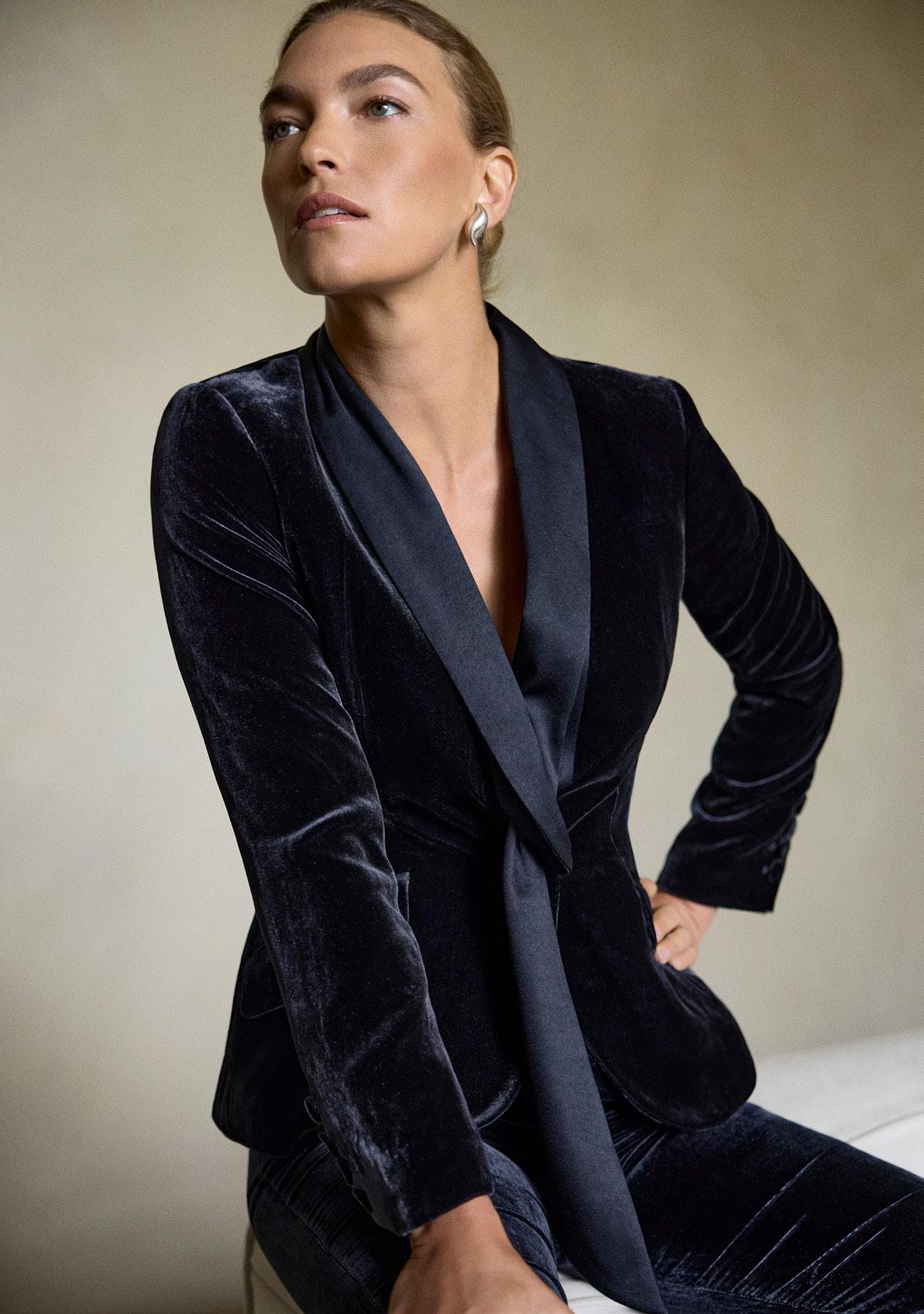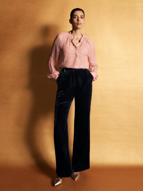 Top , Gold metallic knit. Lexington Trousers , Navy velvet. Treviso 80 Heels , Gold metallic fabric. Also available in black. Lennox Jacket , Navy velvet.