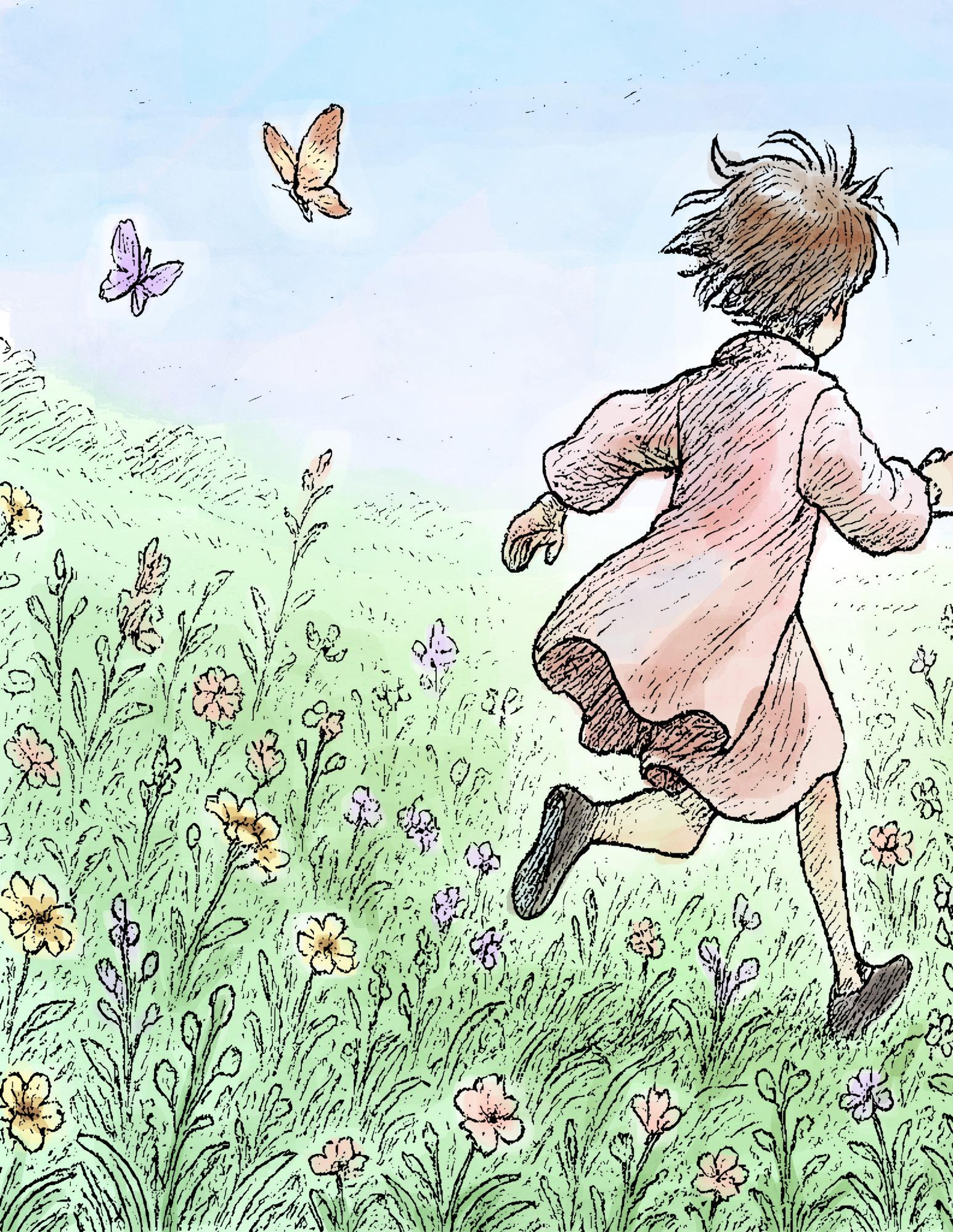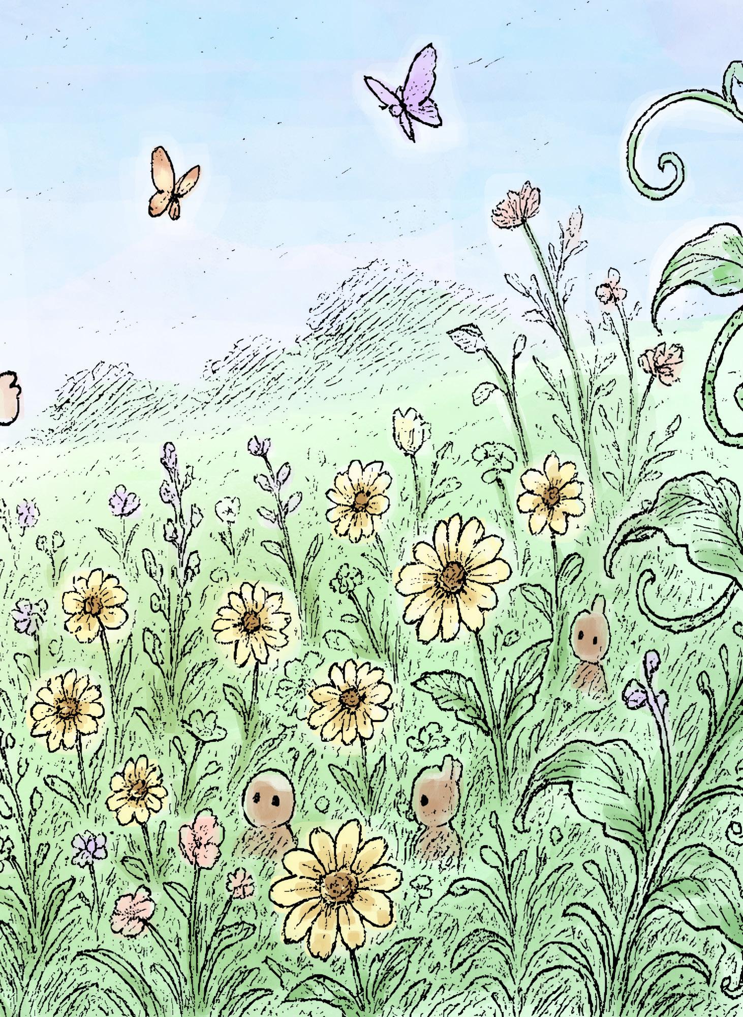 In the soft afternoon light, a faceless child wanders through wildflowers across a meadow, brushing their hands against the petals. If you look closely, you might catch a glimpse before they disappear among the blooms...