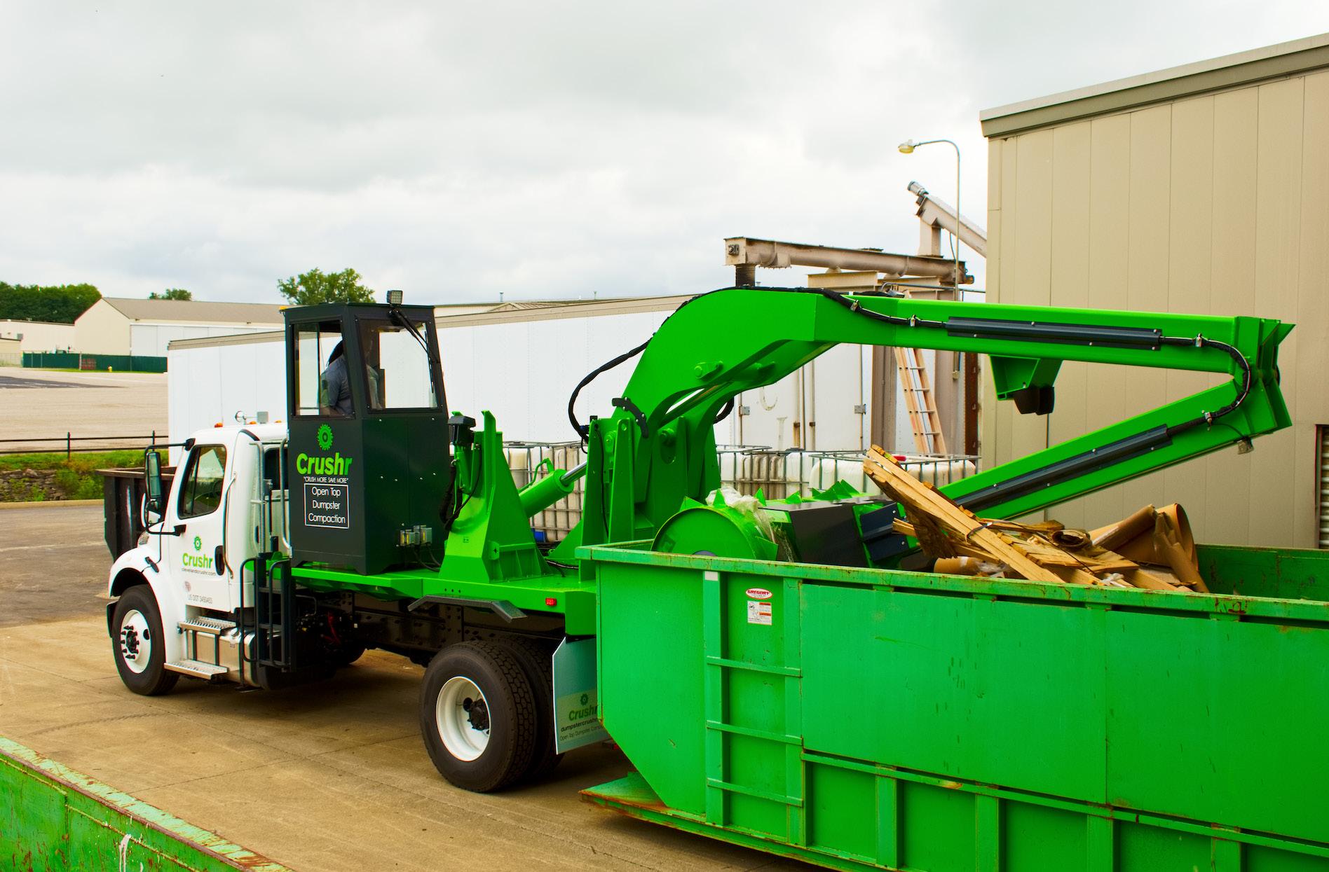 “crush” can increase a dumpster’s capacity by up to 80%. As a result, more waste can be added before the dumpster needs to be hauled to the landfill. Fewer hauls saves Crushr clients both money and downtime, and compacted waste takes up less space in the landfill.