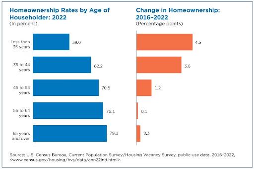 • Fourth quarter 2022 homeownership rates were highest for homeowners aged 65 years and over (79.%) and lowest for homeowners under 35 years of age (38.7%).