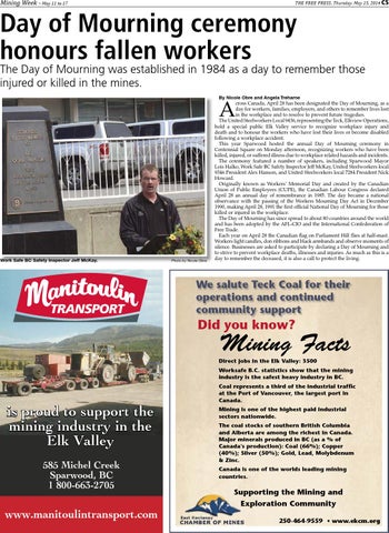 cross Canada, April 28 has been designated the Day of Mourning, as a day for workers, families, employers, and others to remember lives lost in the workplace and to resolve to prevent future tragedies. The United Steelworkers Local 9436, representing the Teck, Elkview Operations, hold a special public Elk Valley service to recognize workplace injury and death and to honour the workers who have lost their lives or become disabled following a workplace accident. This year Sparwood hosted the annual Day of Mourning ceremony in Centennial Square on Monday afternoon, recognizing workers who have been killed, injured, or suffered illness due to workplace related hazards and incidents. The ceremony featured a number of speakers, including Sparwood Mayor Lois Halko, Work Safe BC Safety Inspector Jeff McKay, United Steelworkers local 9346 President Alex Hanson, and United Steelworkers local 7284 President Nick Howard. Originally known as Workers’ Memorial Day and created by the Canadian Union of Public Employees (CUPE), the Canadian Labour Congress declared April 28 an annual day of remembrance in 1985. The day became a national observance with the passing of the Workers Mourning Day Act in December 1990, making April 28, 1991 the first official National Day of Mourning for those killed or injured in the workplace. The Day of Mourning has since spread to about 80 countries around the world and has been adopted by the AFL-CIO and the International Confederation of Free Trade. Each year on April 28 the Canadian flag on Parliament Hill flies at half-mast. Workers light candles, don ribbons and black armbands and observe moments of silence. Businesses are asked to participate by declaring a Day of Mourning and to strive to prevent workplace deaths, illnesses and injuries. As much as this is a day to remember the deceased, it is also a call to protect the living.