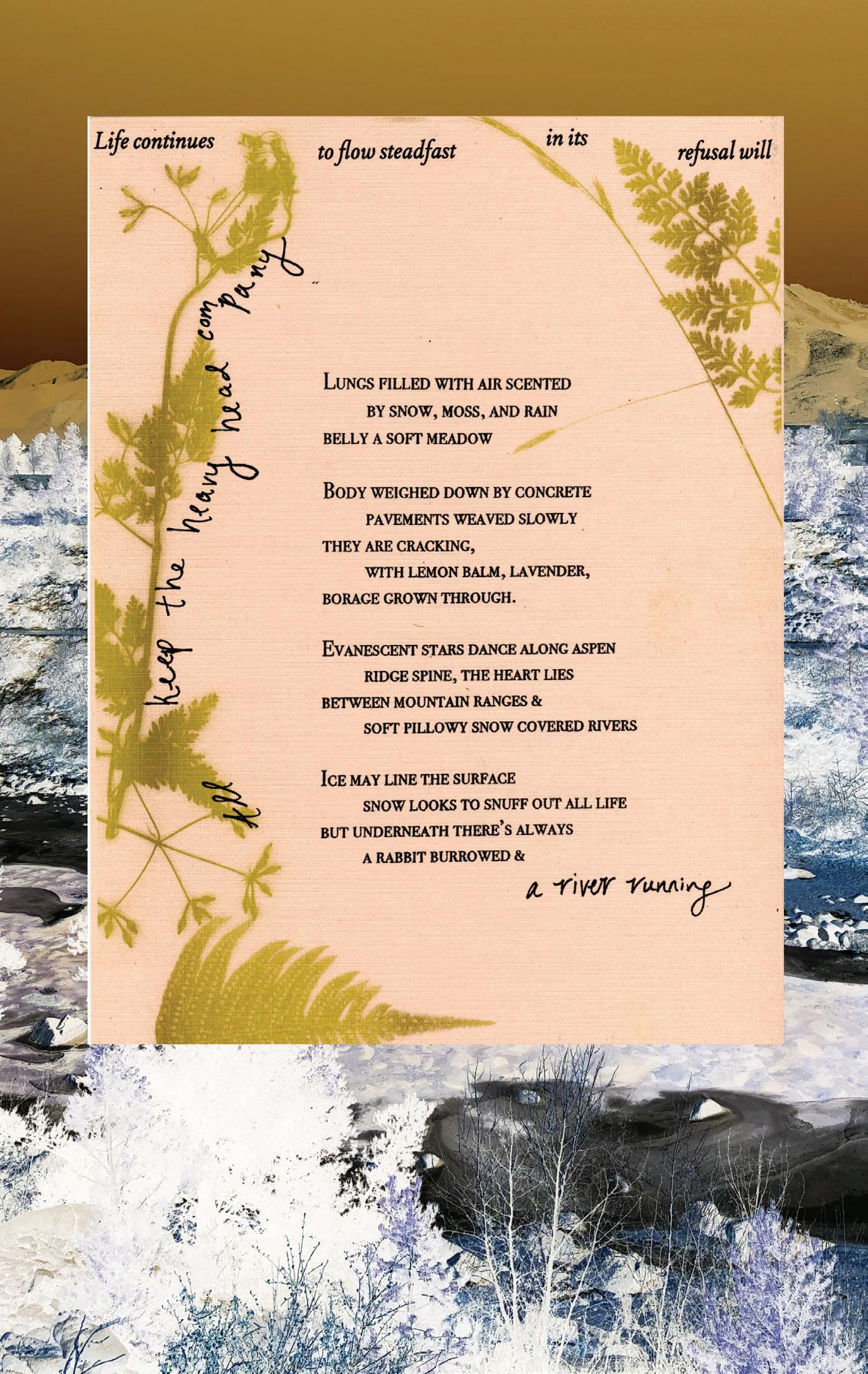 Content Warning: This issue, and the contributors therein, spend considerable time reckoning with and examining the many ways Queer ecology shows up and manifests in our lives, thoughts, and work. In doing so, contributors and staff alike have addressed and explored topics including homophobia, transphobia, queerphobia, slurs (both reclaimed and weaponized), gender dysphoria, sex, sexuality, religion, ecological devastation (including the recent wildfires in LA), climate crisis, environmental racism, ableism, medical trauma, eugenics, the COVID-19 pandemic, colonialism and domination, enslavement, capitalism, settler ideology, citizenship status, mental illness, mentions of disordered eating and eating disorders, needles, blood, physical injury, death, decay, grief, and substance use, among others. These themes are all interwoven with both the Earth and our history and community. We hope you manage your discomfort as it arises and take steps to care for yourself.