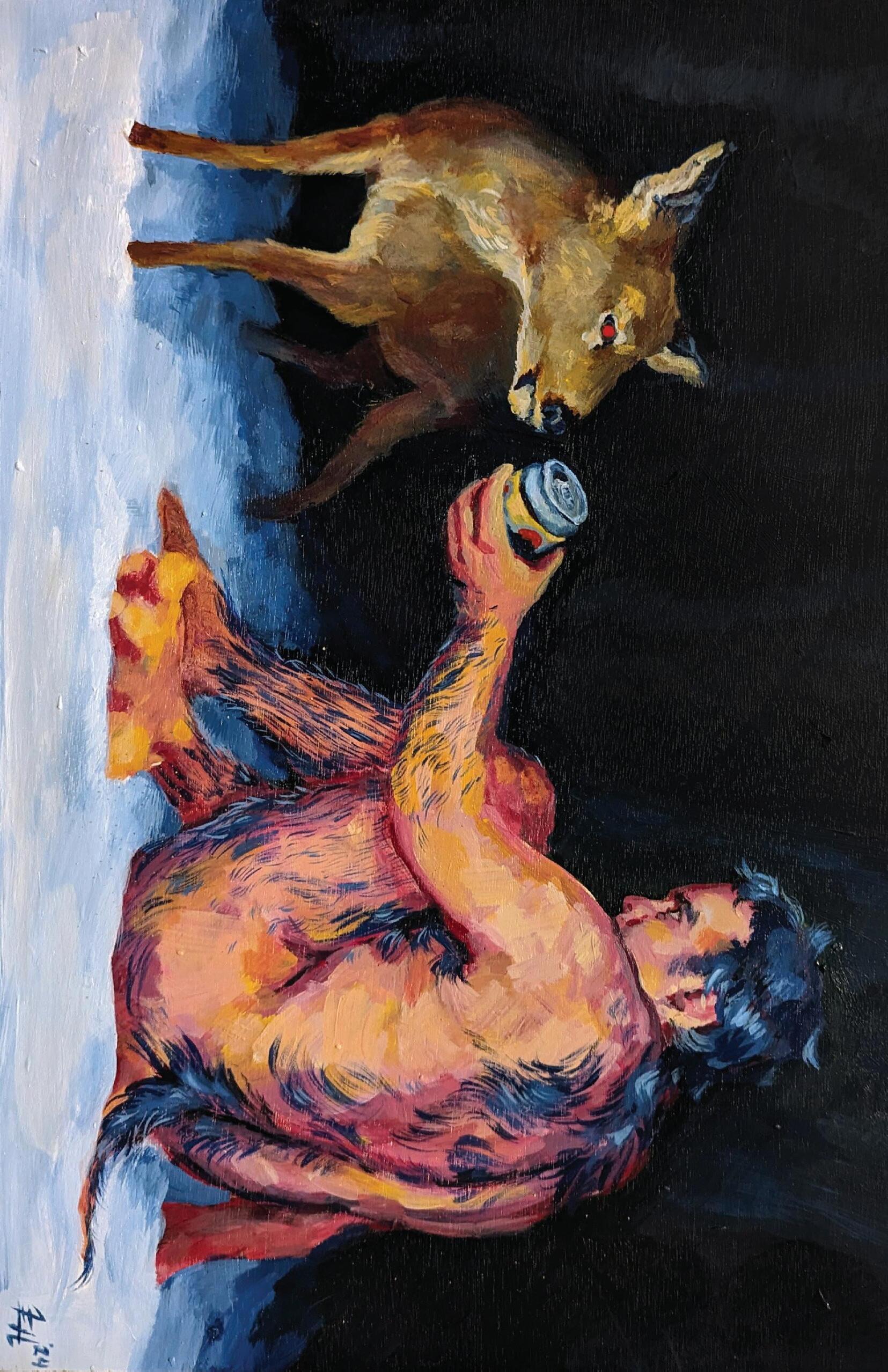orion (aka puppy) (they/them) known informally as puppy, is a multimedia artist based in Tulsa, Oklahoma. They seek to deconstruct and work through their own connections to animals as a way of better understanding the self and perception of their experiences. Their work most often depicts natural colors and freeform acrylic painting. The recurring theme within their works of all medium is a “stray dog mentality” of fight or flight and submission.