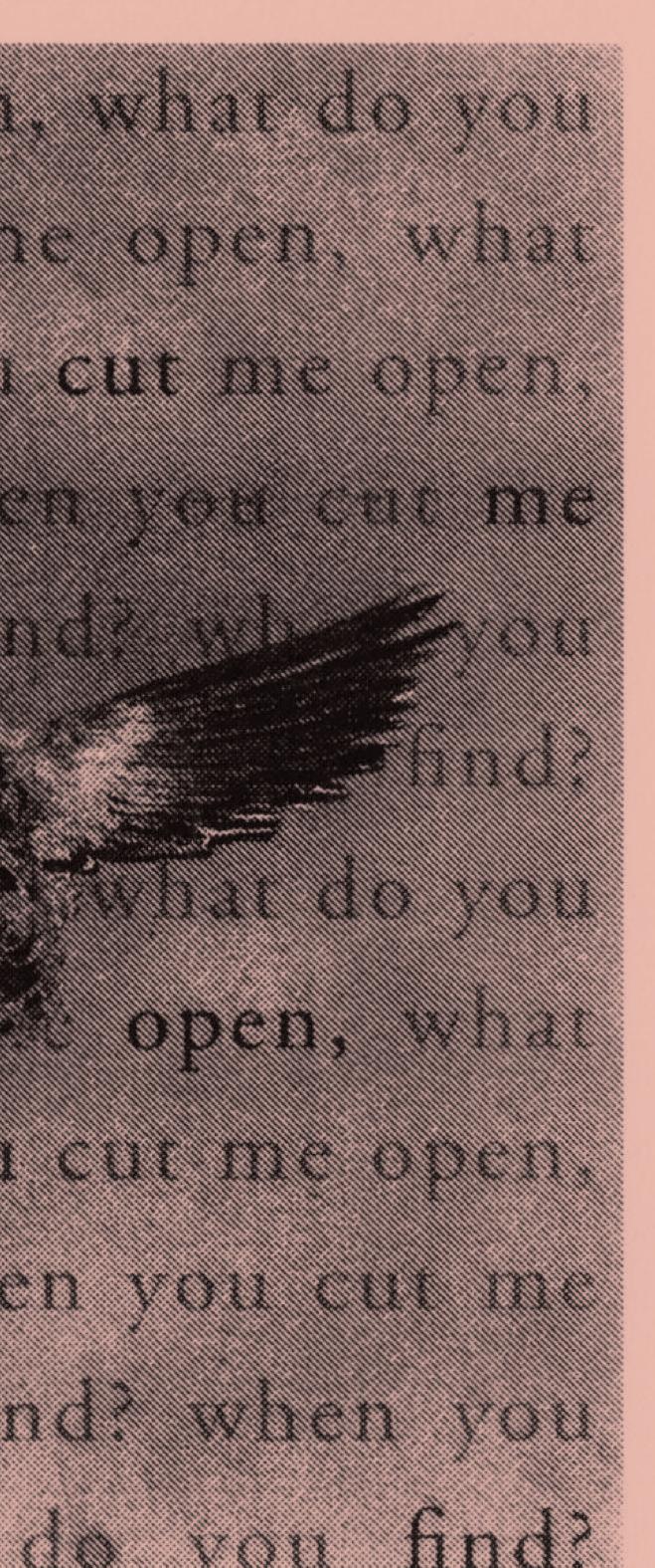 It was so dark, I could see the nightmares, could rap my empty knuckles on them. News feeds. Telegraphed pain from other people, other places, toxic bones, too much sleep, too little. I left my hands out of my pockets, let them go cold, and you were watching me like I was a feral knot of something starved.