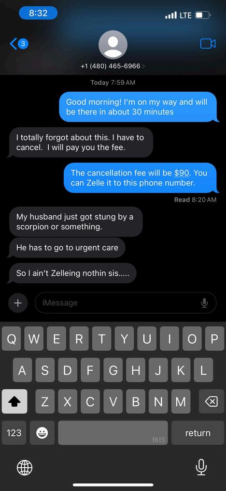 I‘m a mobile groomer and texted my client I was on my way when they cancelled on me last minute: