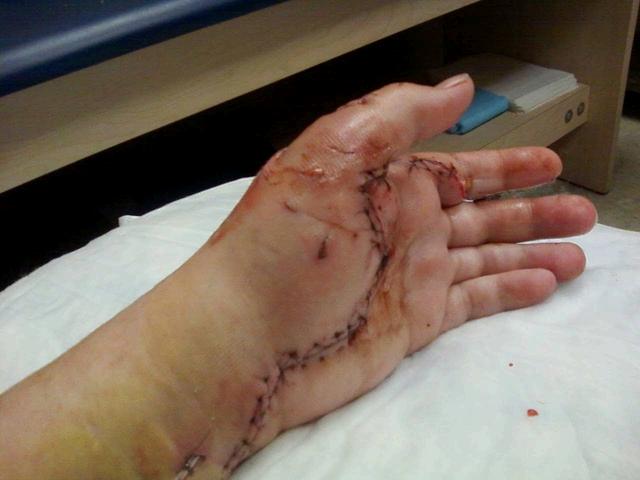 About 36 hours later, the pain was no longer responding to pain medication, ice, etc Also, the redness began to spread up my arm quickly I returned to the ER and was admitted into the hospital and started on IV antibiotics The next day, the hand surgeon came in and told me I needed surgery to open my hand and debride the infected tissue I had one surgery, a day off, and another surgery There were 34 sutures and 3 drains in my hand I also received a PICC line for antibiotics that lasted about a month They did a culture, but it didn't grow anything. They told me it was likely because I was started on antibiotics immediately I went to physical therapy for about 3 months following surgery The surgeon wasn't originally sure if he would be able to save all, or any, of my hand Thankfully I still have the whole thing I do have some chronic pain and somewhat limited range of motion in my thumb, but that's it I'm right-handed anyway I later found out that a tech who worked in the surgery department had her hand just grazed by his teeth the day after I was bitten, and it swelled an unusual amount for such a superficial wound and even had blistering around it I wish the culture could have identified what that cat had growing in his mouth, cuz it was nasty!
