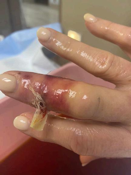 I quickly ran my finger under cold tap water to rinse it and went off to the hospital I've had infections before from cats No thank you After waiting 5 hours in emergency and the ER nurses refusing to even help clean up the pulsing blood and try to sterilize the finger, I went home to take care of it myself It had already been brewing bacteria for 6 hours at that point and getting more swollen and gooy I thought my finger was going to explode Luckily a friend who works in admissions walked by and I was able to get an ice pack from her I held my hand on the ice pack to help with the pain till we got home All while squeezing blood that was pooling in the cavities Two days later my finger puffed up to the point I couldn't even bend it, so I had to do telecare They quickly prescribed me three different antibiotics and an ointment to always have on the cuts
