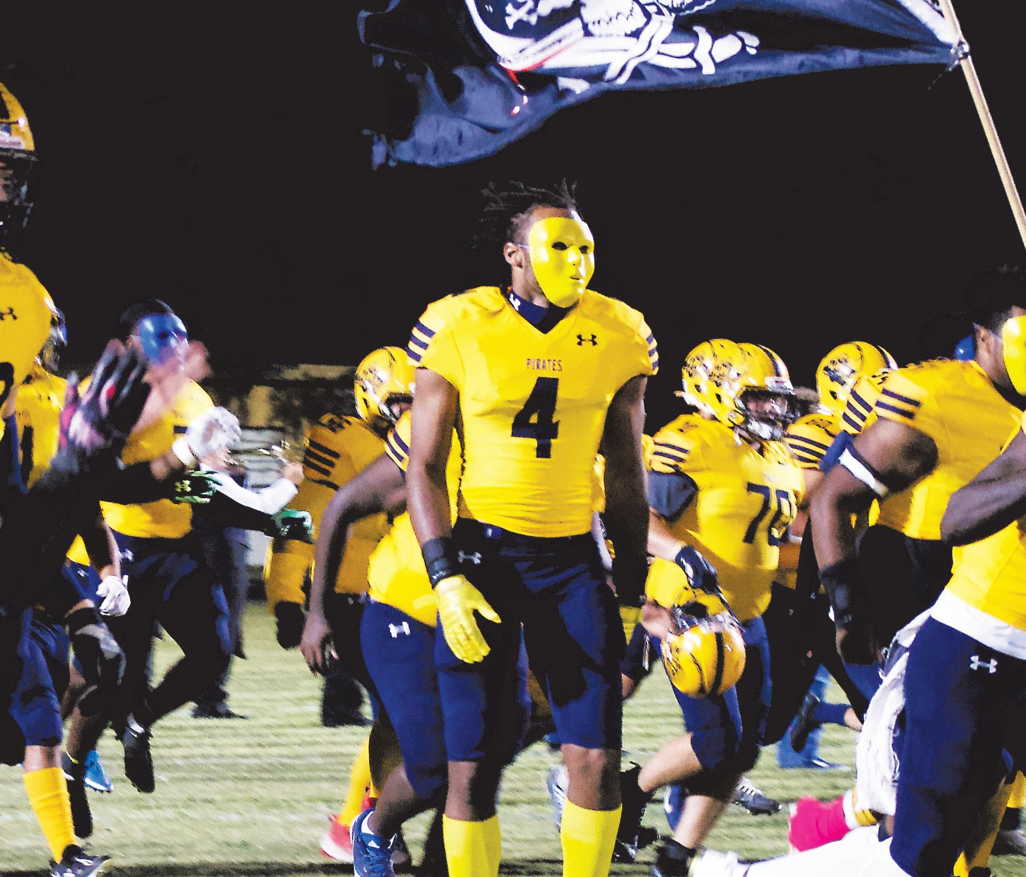 On the second play of the second quarter, Wyman intercepted a pass and scored on a 59-yard return. The Pirates scored again within 20 seconds, as a bobbled snap on first down was recovered by Freeman and Tyrann Newsome scored on a reverse on the next play.