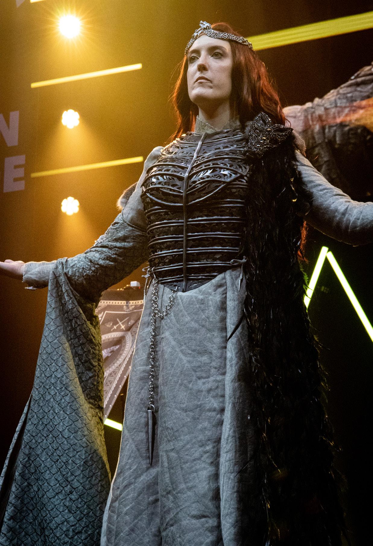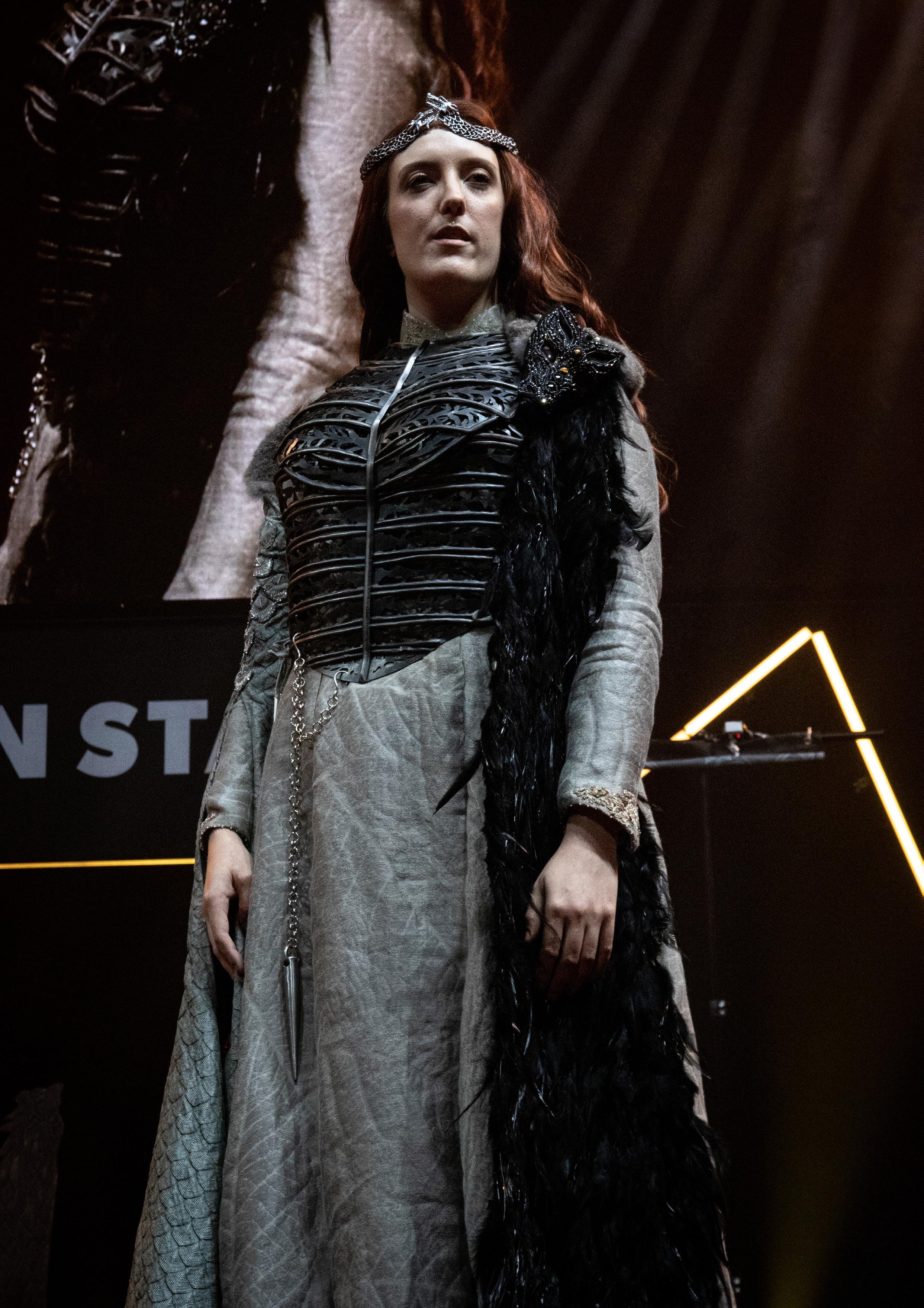 Accompanied by a spine-chilling performance where she gave a speech of Sansa’s journey from childhood to queenhood, Beth (AmazonCosplay) truly sold her cosplay to every single member of the audience and the judges! Her cosplay took a full 3 years to create, using every technique you could possibly think of. One year was purely dedicated to hand embroidering the red leaves on the inside of the sleeves. Beth did an obscene amount of research on the costume, going as far as choosing the same fabrics that were used in the show in order to make it as screen-accurate as possible. Thousands of beads and crystals weresewn into the costume along with 25 metres of feathers.