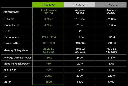 First up lets run the specs between the 4070 and its predecessors the 3070 & 3070Ti...