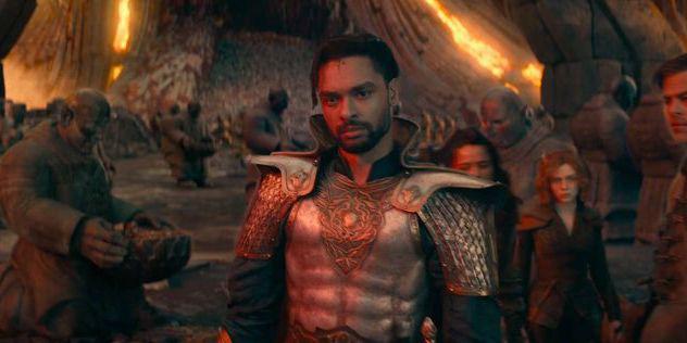 It would be rude not to mention the, although short-lived, but iconic appearance of Xenk Yandar (Rege-Jean Page), a Paladin devoted to justice and good. Needing a special helmet from him, the team meet him for the first time after he rescues a Tabaxi baby from the mouth of a giant fish. His character is a hero, through and through, with no sense of humour and a direct way of speaking. He was honestly such a hilarious character and I was kind of sad to see him leave only after being in the movie for 10 minutes! Lastly, there was Forge, played by Hugh Grant. One of the villains of the story, Forge is a somewhat charismatic Rogue who betrayed his party by striking a deal with the Red Wizard Sofina (Daisy Head). He got wealth and fame in exchange for allowing a great many people to perish in order for the Red Wizards to gain power. Hugh plays a fantastic
