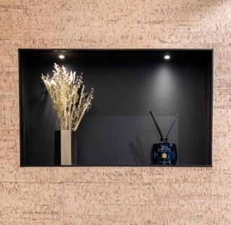 Stylish and practical intergrated recessed wall shelving.