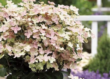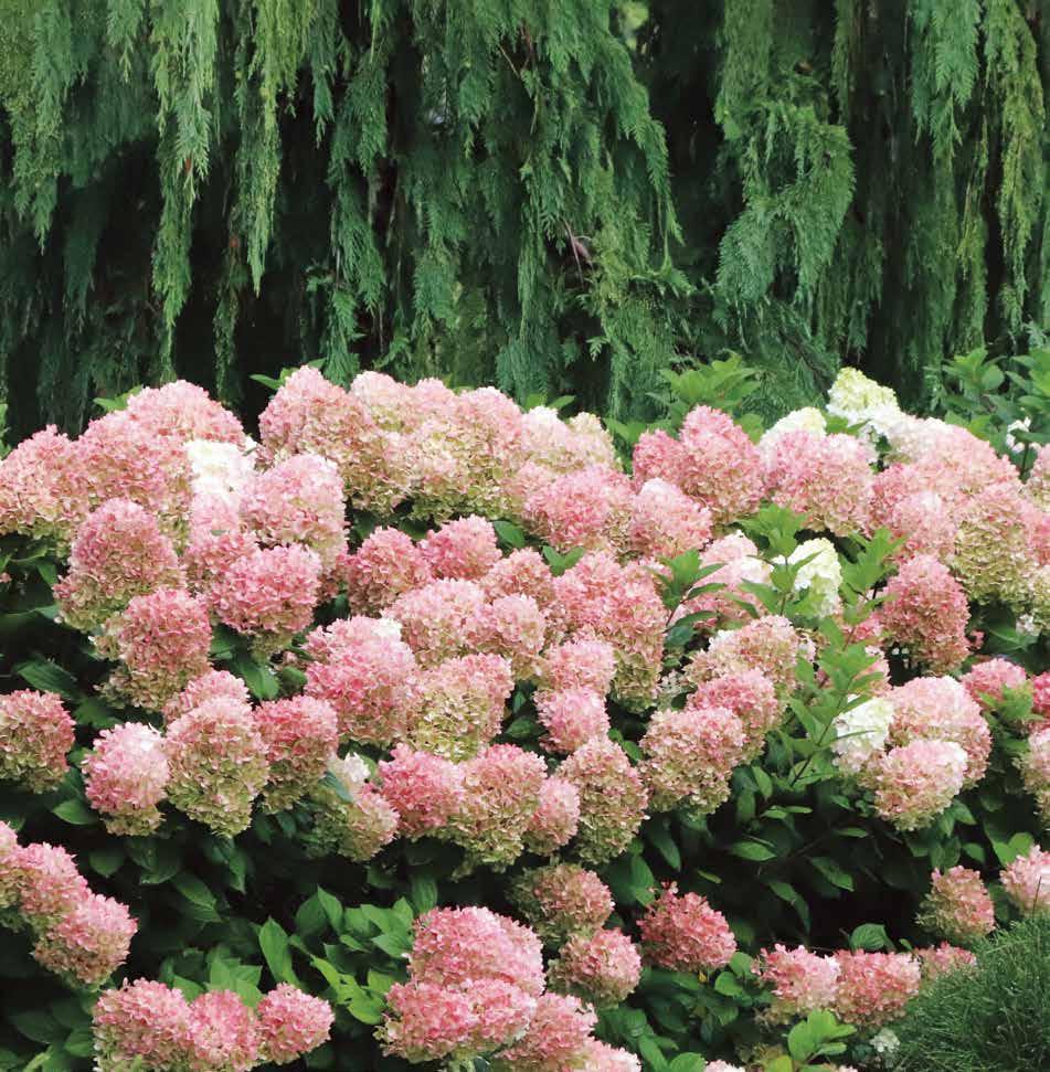 One of the smallest panicle hydrangeas available, ‘Early Evolution’, adds large pops of flowers on teeny shrubs. Flowers begin to appear in early June, with the creamy white flowers appearing in large clusters. As flowers mature, they take on a dusty rose-pink color and transform into salmon pink in fall. The flowers appear on the shrubs for months. The flowers dry right on the shrub, bringing considerable interest to the winter landscape. Growing only about 2’tall and wide, Early Evolution may be used to create small hedges, particularly lining a walkway or patio. It is also a choice plant for where small, long-blooming accents are needed.