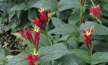 Indian Pink (Spigelia marilandica) puts out tubular red flowers with yellow throats that hummingbirds are drawn to in early