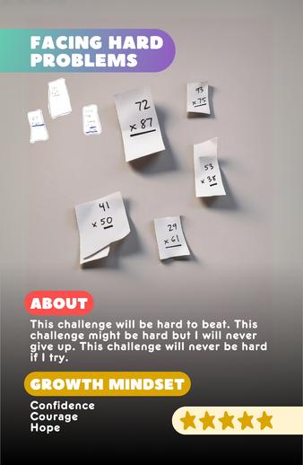 Use Growth Mindset Challenge Cards to add a conflict to your story. Give an introduction and backstory on how your character arrived at this challenge. Your goal is to solve the challenge as quickly and thoroughly as possible while ensuring the story still makes sense.