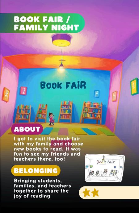 I got to visit the book fair with my family and choose new books to read. It was fun to see my friends and teachers there, too!