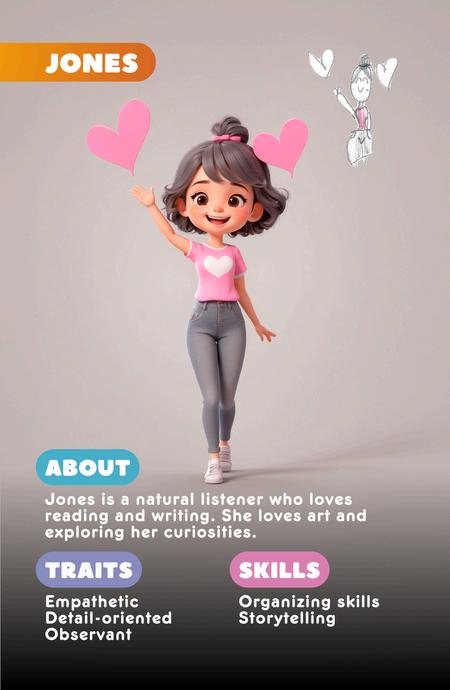 Jones is a natural listener who loves reading and writing. She loves art and exploring her curiosities.