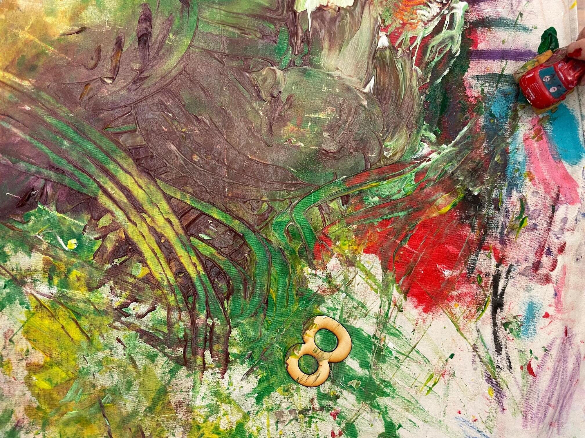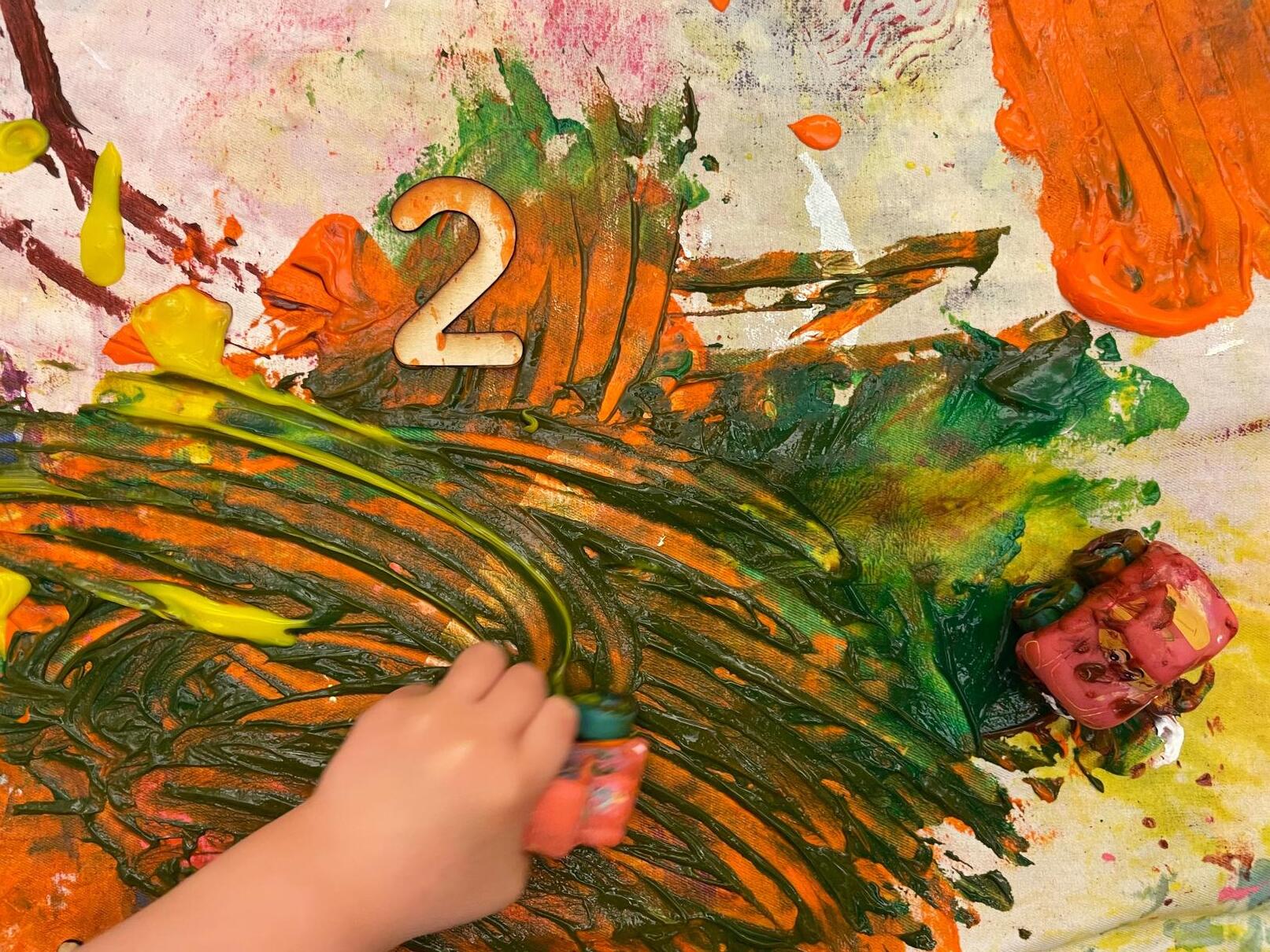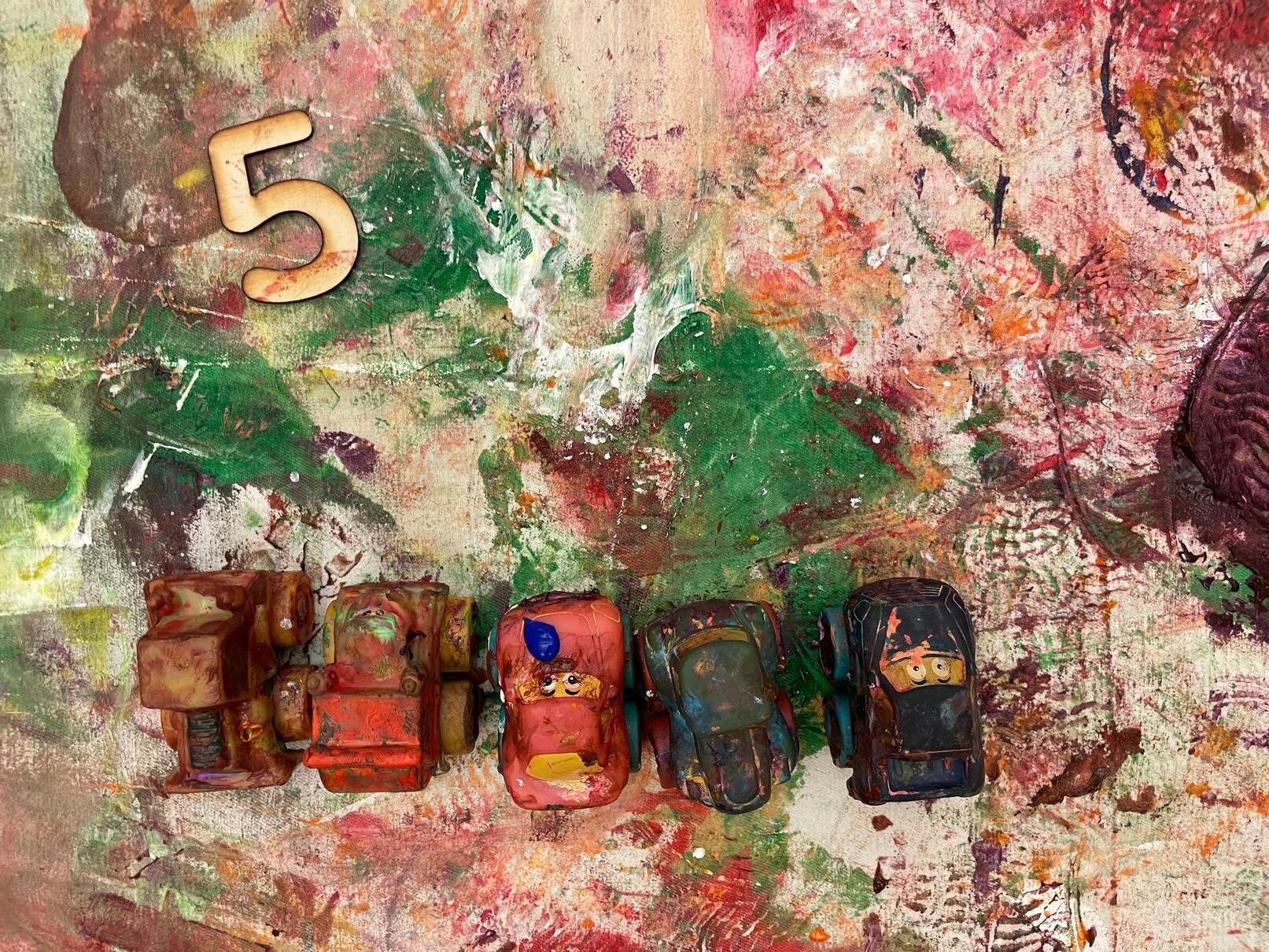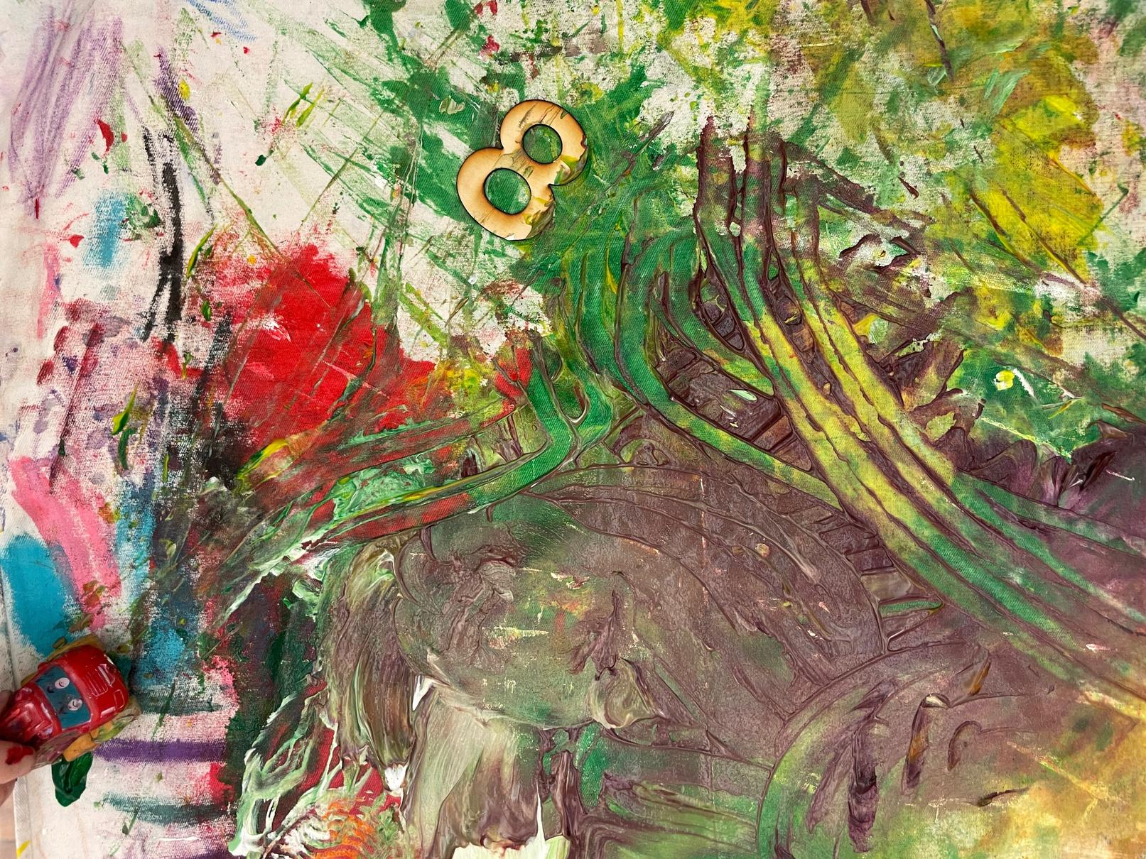 We invited our little creatives to paint a GIANT mural with their hands, bodies, brushes, cars, number cut outs, and their imaginations. Our creatives mixed and remixed colors, explored patterns, touched and played with numbers, and together created a lively painting. Every single painting you’ll see in this book has been created with their little hands and GIANT minds. Their animal avatars are made using AI tools.