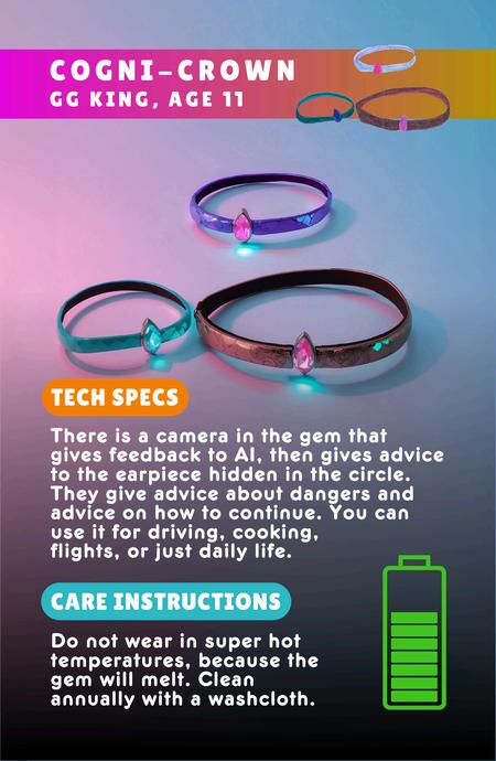 There is a camera in the gem that gives feedback to AI, then gives advice to the earpiece hidden in the circle. They give advice about dangers and advice on how to continue. You can use it for driving, cooking, flights, or just daily life.
