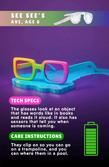 The glasses look at an object that has words like in books and reads it aloud. It also has sensors that tell you when someone is coming.