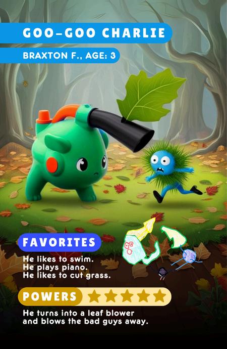 He turns into a leaf blower and blows the bad guys away.